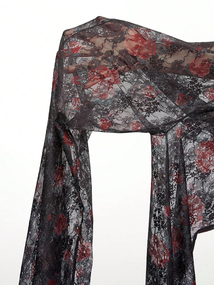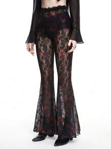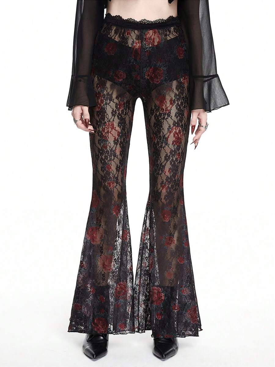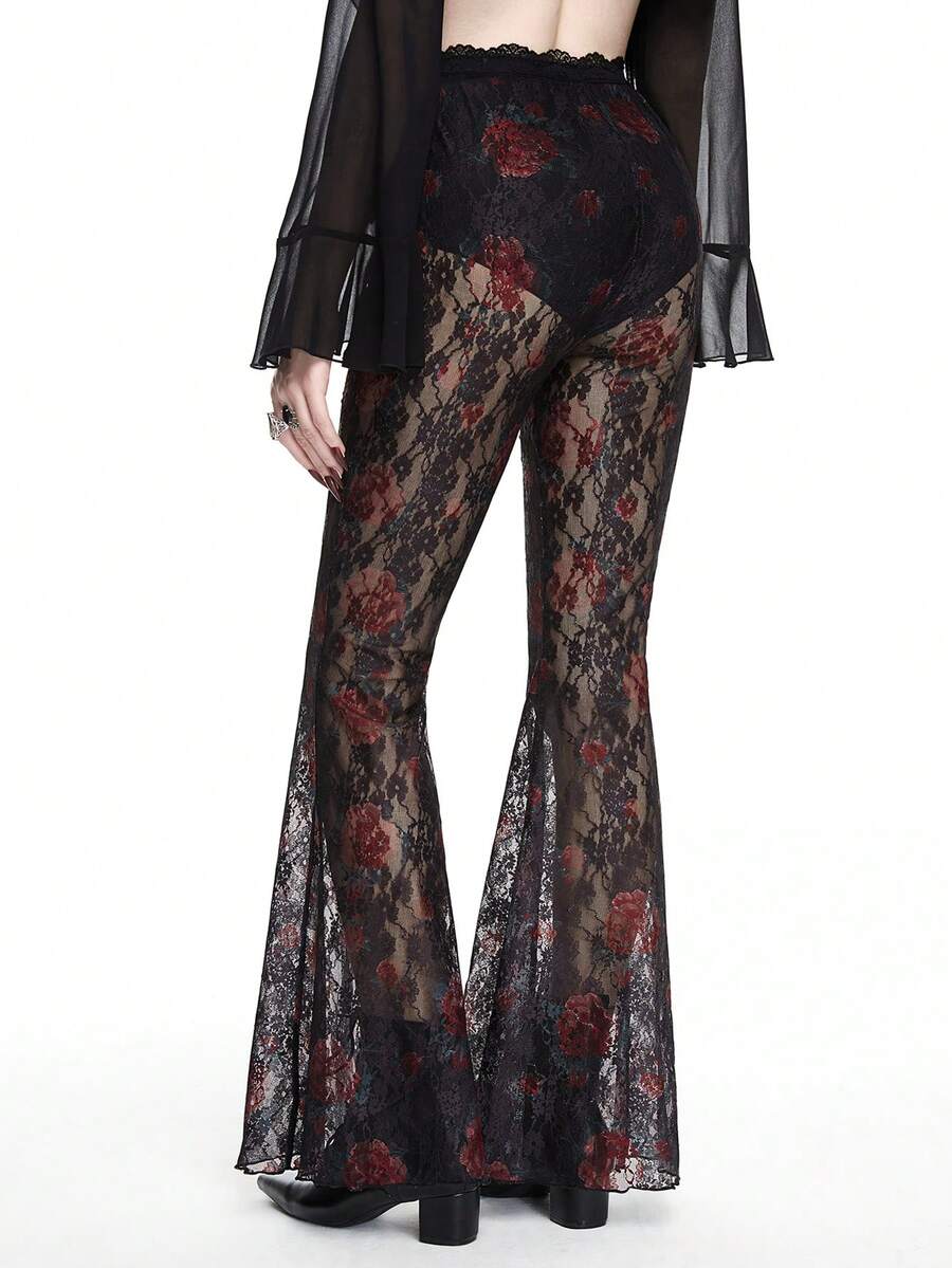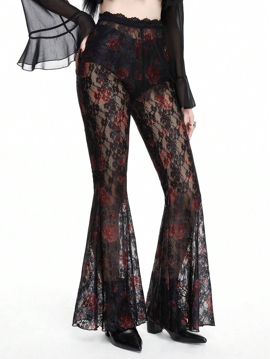 Adams Gothic Style Women Flare Pants With Rose Lace Print