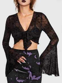 Goth Allover Print Tie Front Bell Sleeve Crop Top