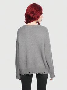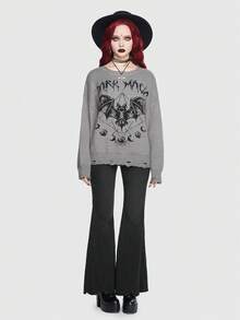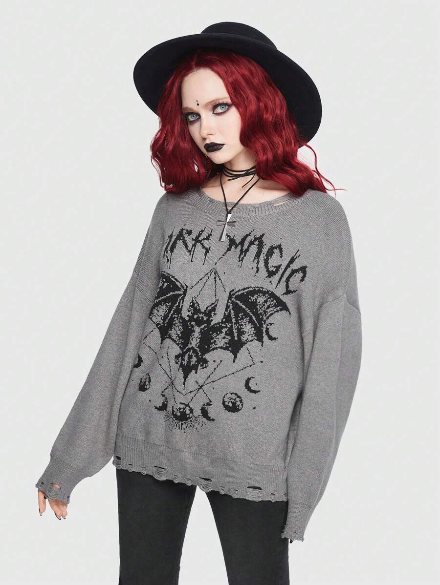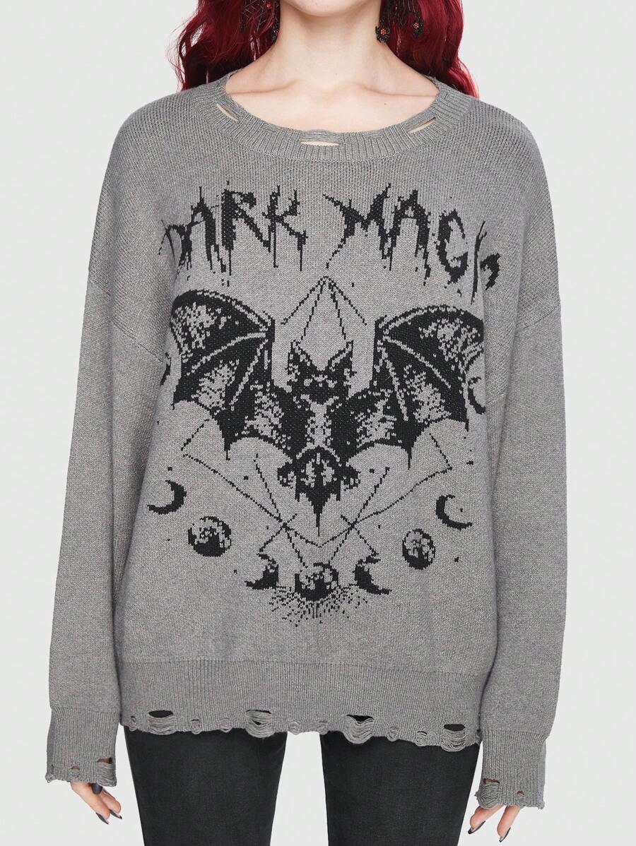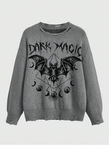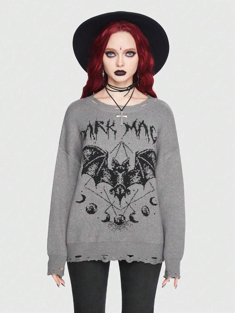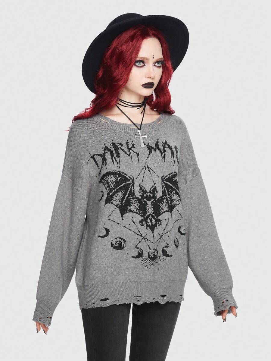 Goth Bat Pattern Drop Shoulder Distressed Sweater