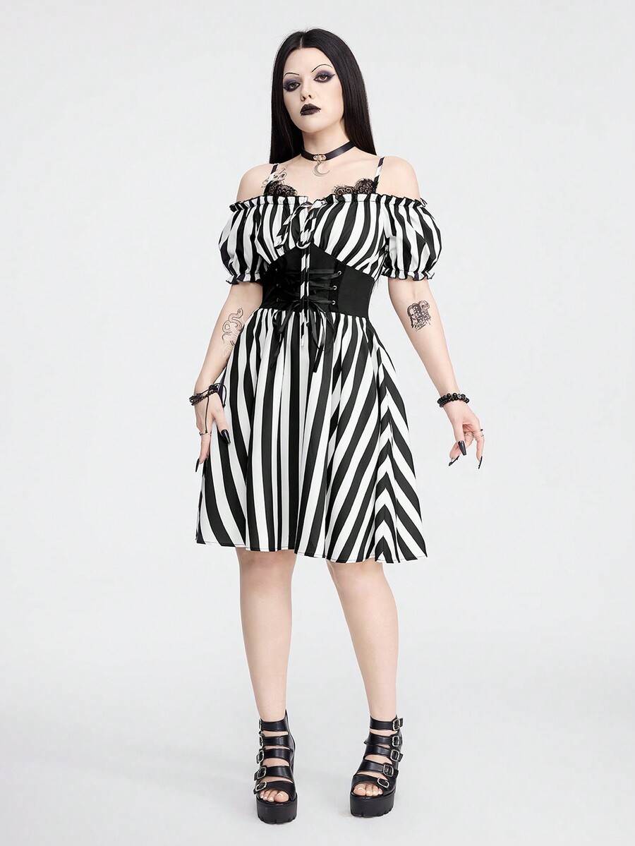 Goth Black And White Striped Off Shoulder Patchwork Waistband Slim Fit Women Dress, 2 Pieces Style