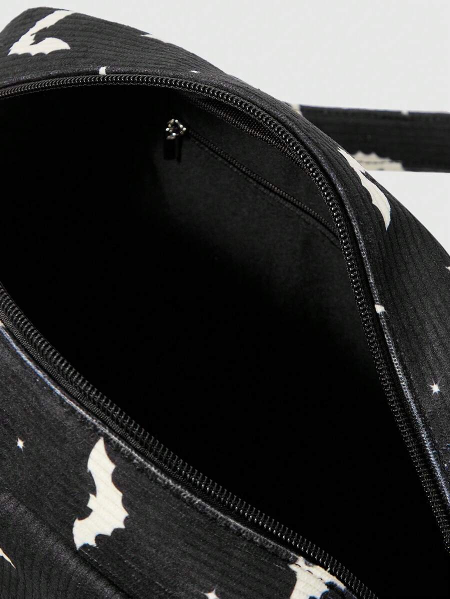 Goth Black Bat Print Corduroy Bowknot Decor Portable Tote Bag For Women