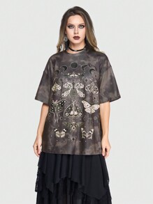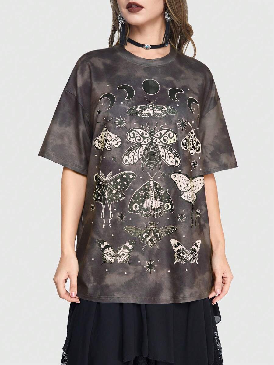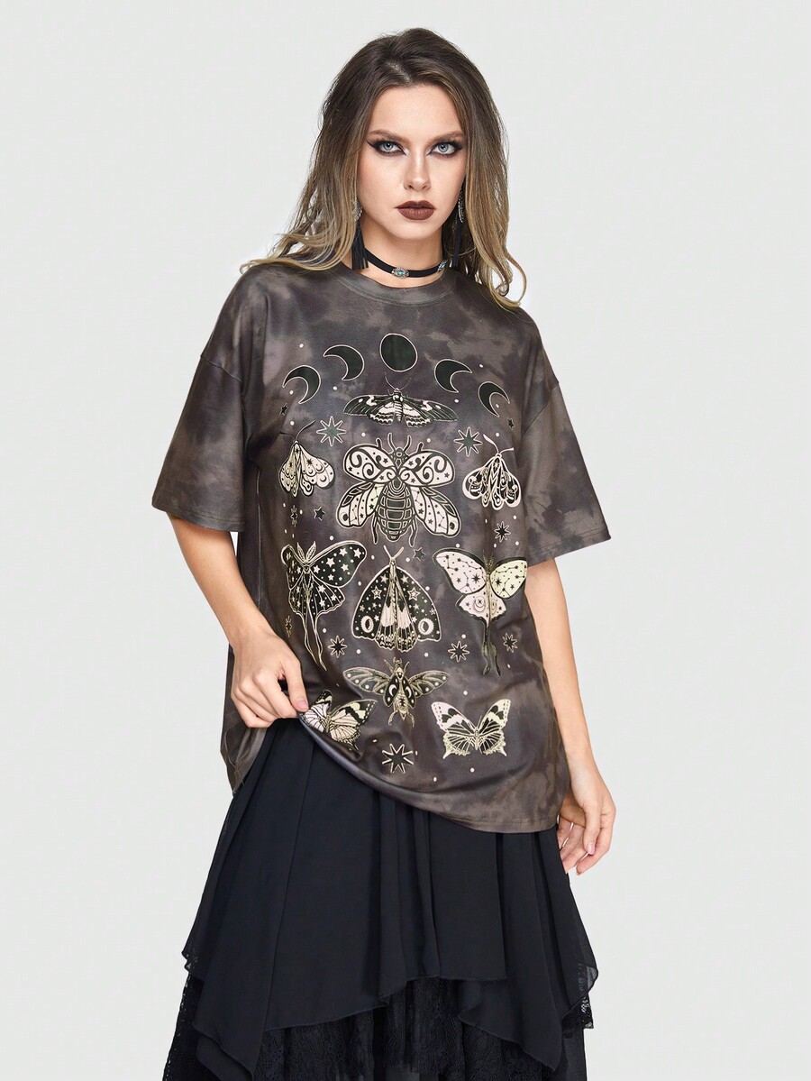 Boho Dark Gothic Style Insect, Butterfly, Moon, Star Printed Casual Loose Tie-Dye T-Shirt