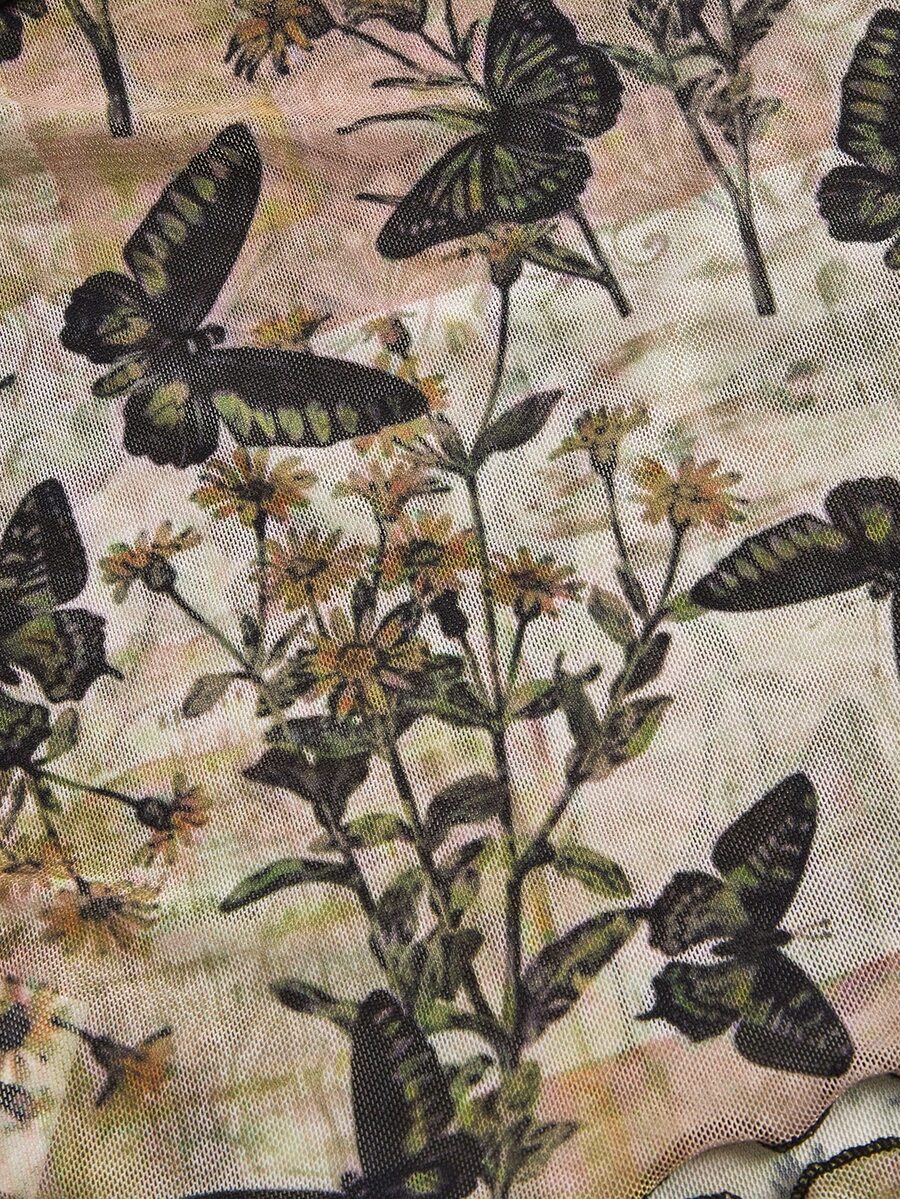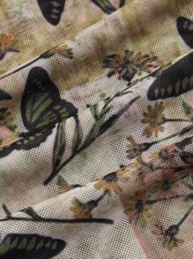Butterfly Print Off Shoulder Trumpet Sleeve Mesh Top