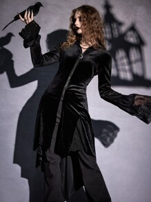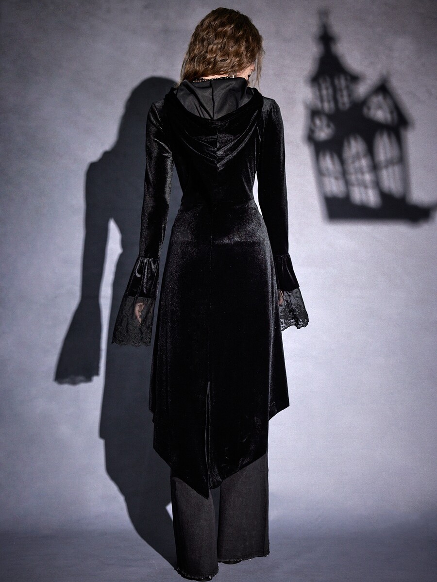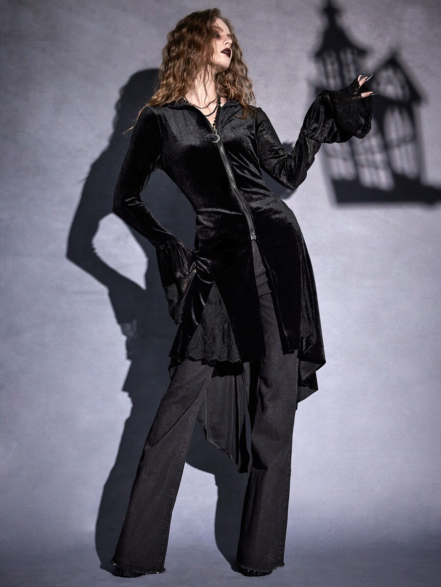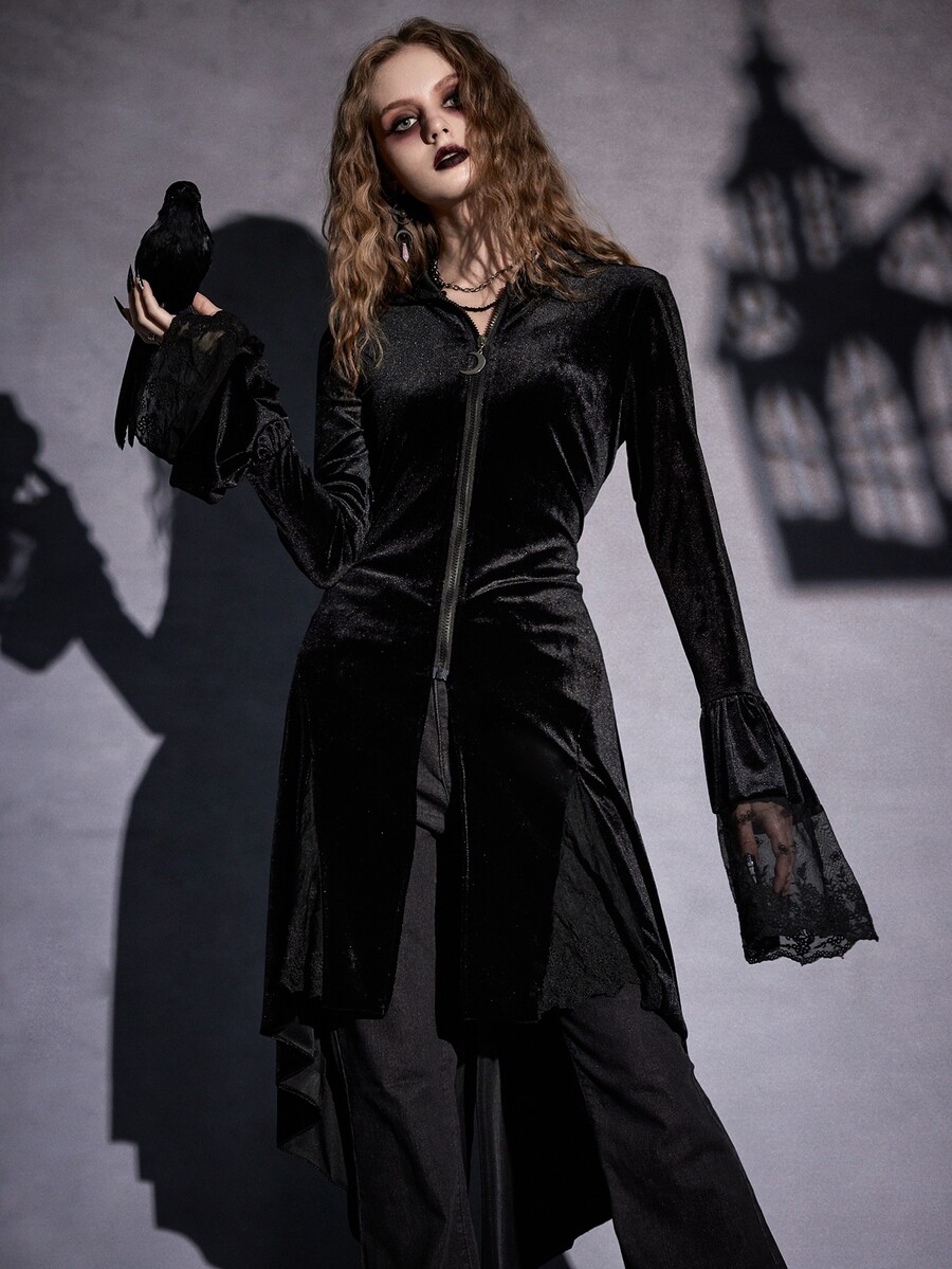 Goth Contrast Lace Zip Up High Low Hem Velvet Coat