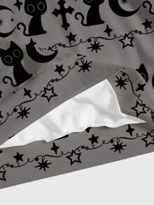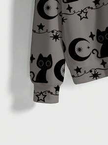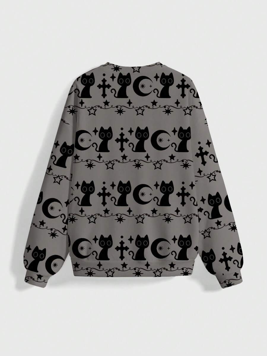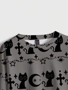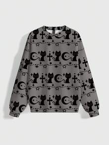 Goth Dark Cat Cross Print Cute Round Neck Long Sleeve Women Sweatshirt, Autumn/Winter/Spring