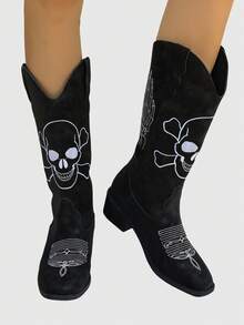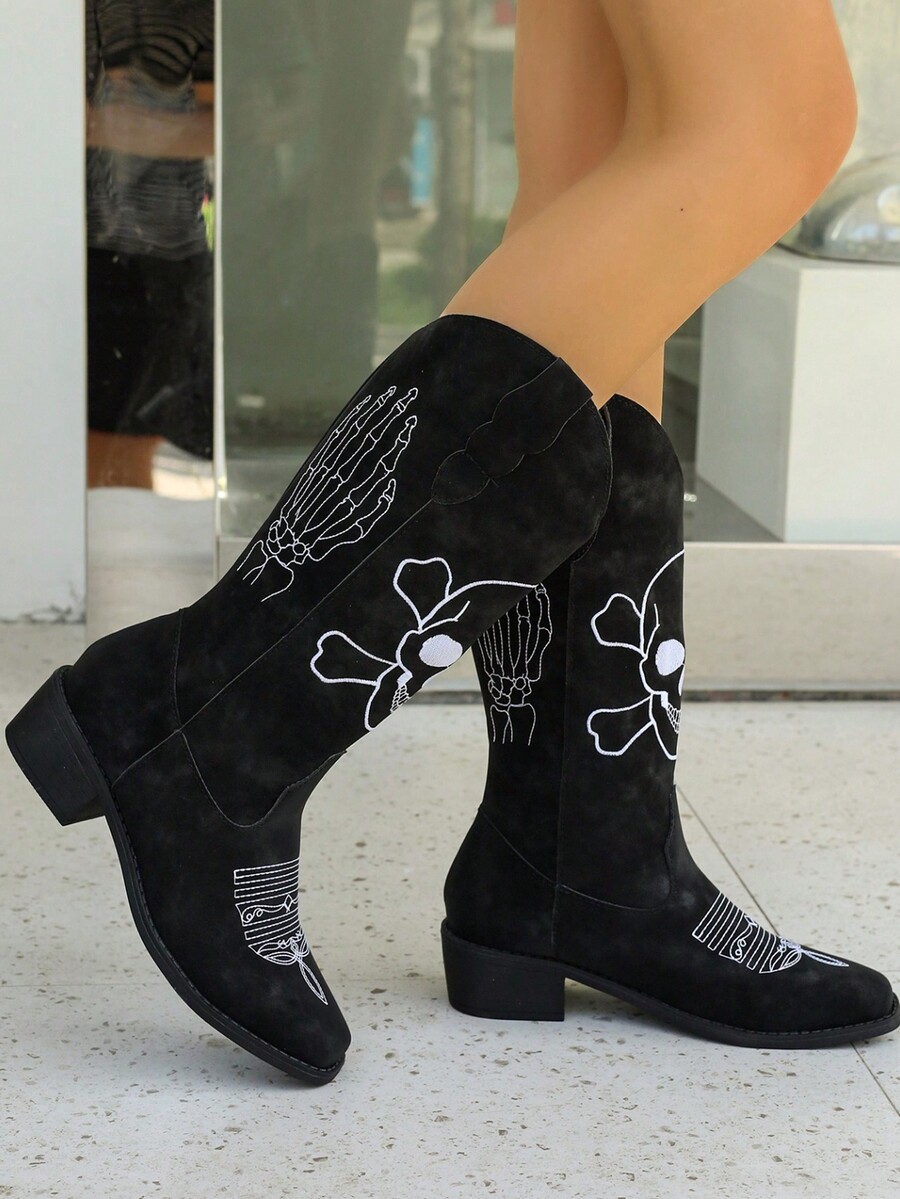 Goth Dark Punk Skull Ghost Hand Embroidery Design Square Toe Chunky Heel Over-The-Knee Western Knight Boots