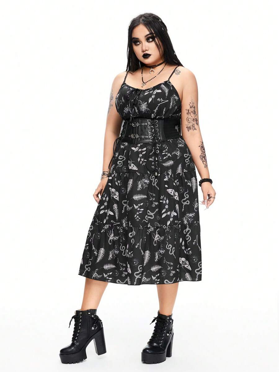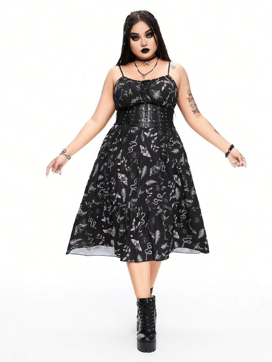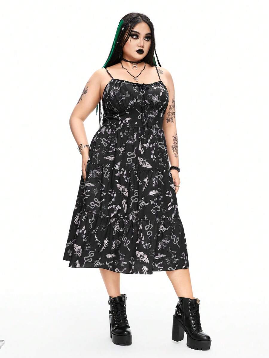 Goth Dark Snake Demon Moth With Floral Print Plus Size Triple Tiered Ruffle Hem Cami Dress