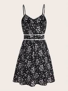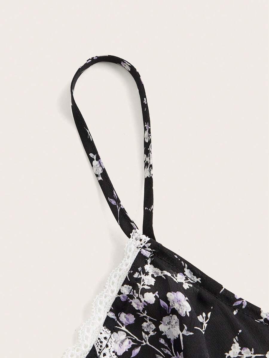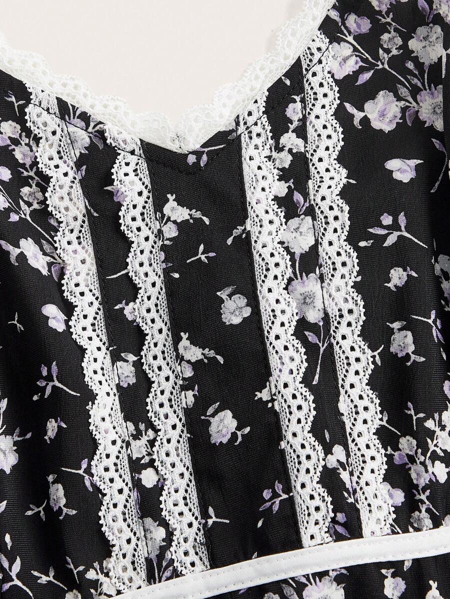Goth Ditsy Floral Print Contrast Lace Cami Dress