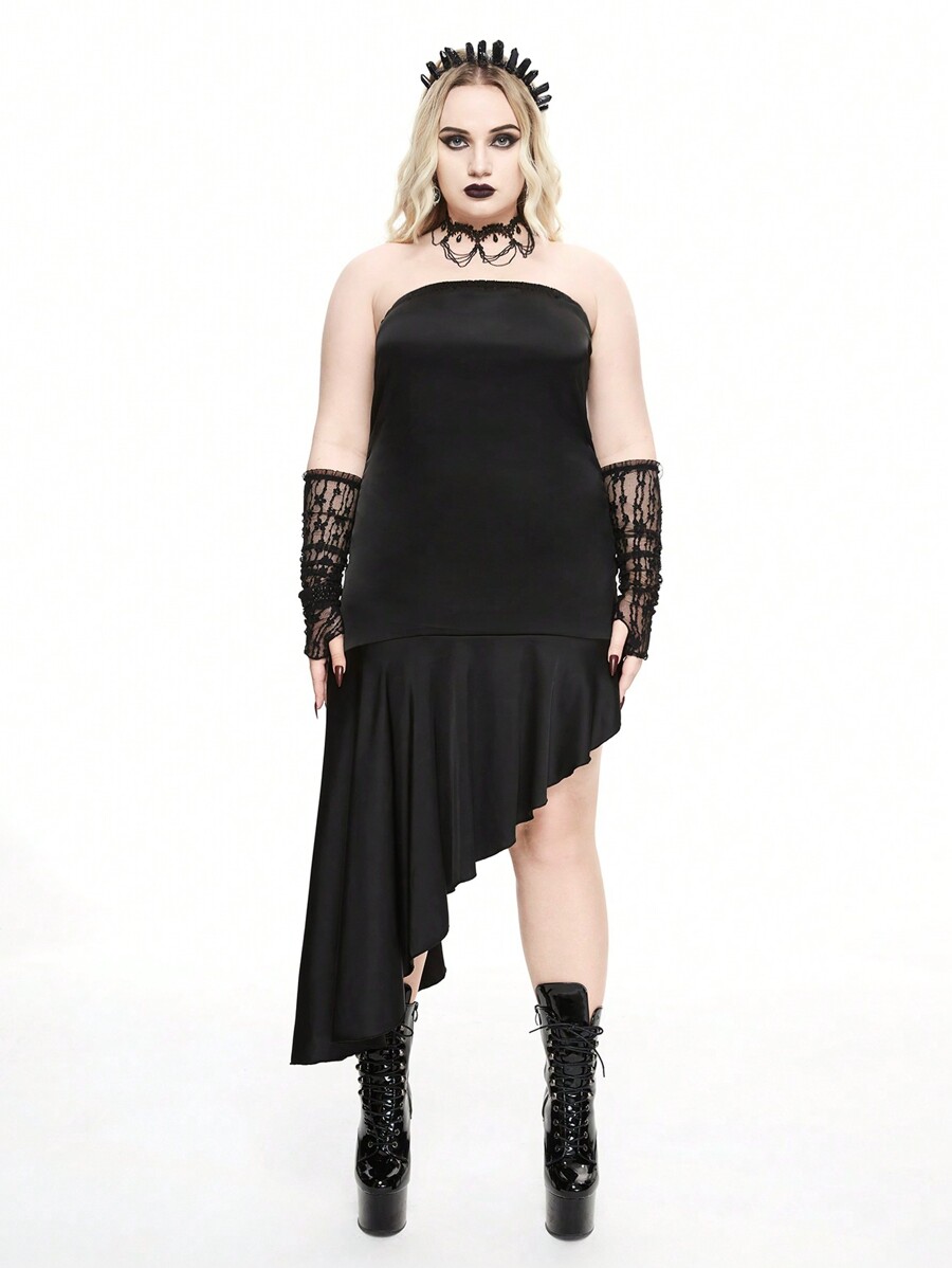 Goth Elastic Satin Strapless Asymmetrical Hem Bodycon Plus Size Dress