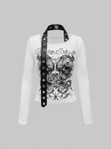 Goth Fashion Women's Spring/Summer Skull Print Splicing PU Leather Peplum Long Sleeve T-Shirt With Eyelets
