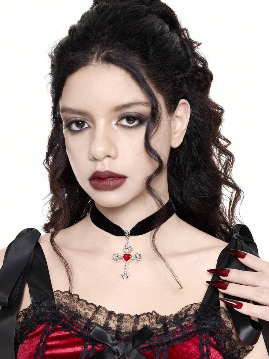 Goth Fashionable Creative Unique Red Heart Rose Cross Shaped Pendant Necklace