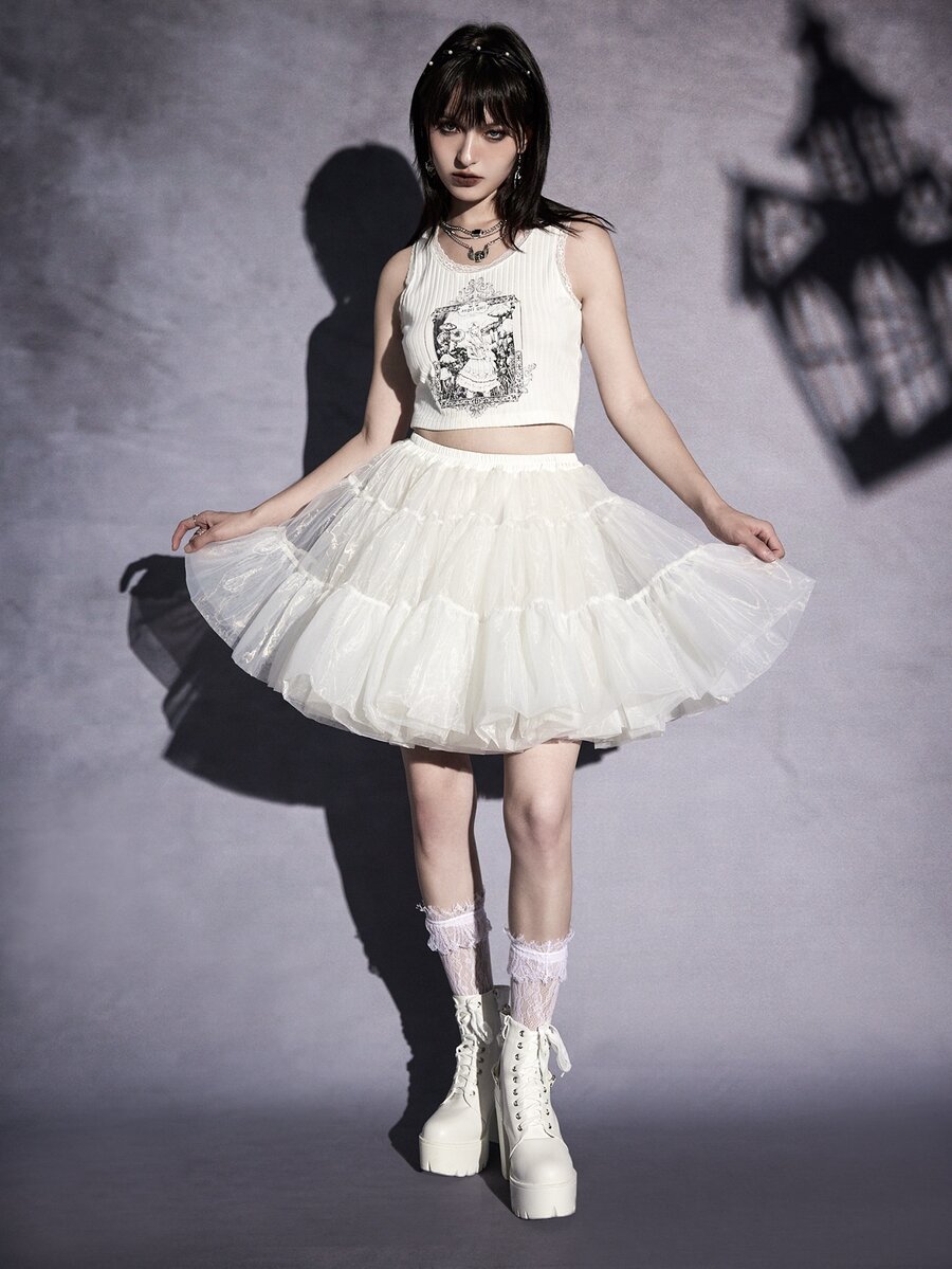 Goth Figure Print Contrast Lace Tank Top