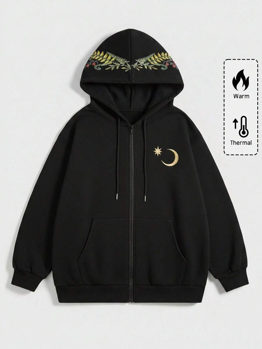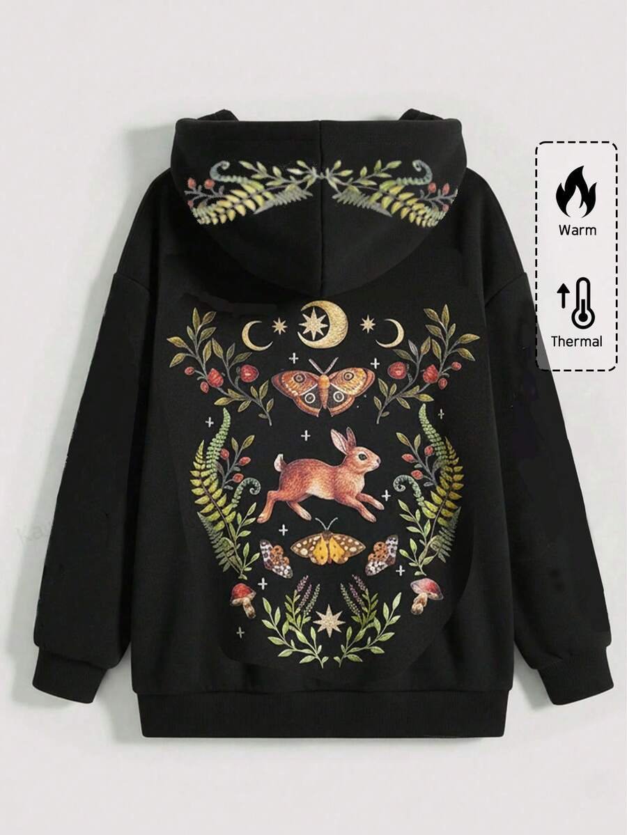 Forest Gothic Rabbit Star Moon Butterfly Thorn Plant Jungle Pattern Heat Transfer Black Plus Size Hoodie, Retro Forest Gothic Style Women Hoodie Jacket, Vintage Print Plus Size Women Hoodie