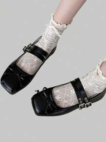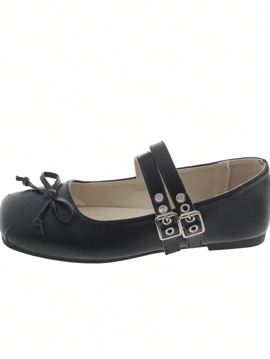 Goth French Vintage Style Bowknot Ballet Flats, Mary Jane Shoes For Girls And Students, With Double-Row Buckle, Comfortable And Low Vamp