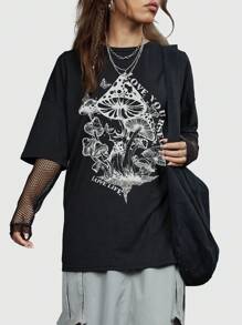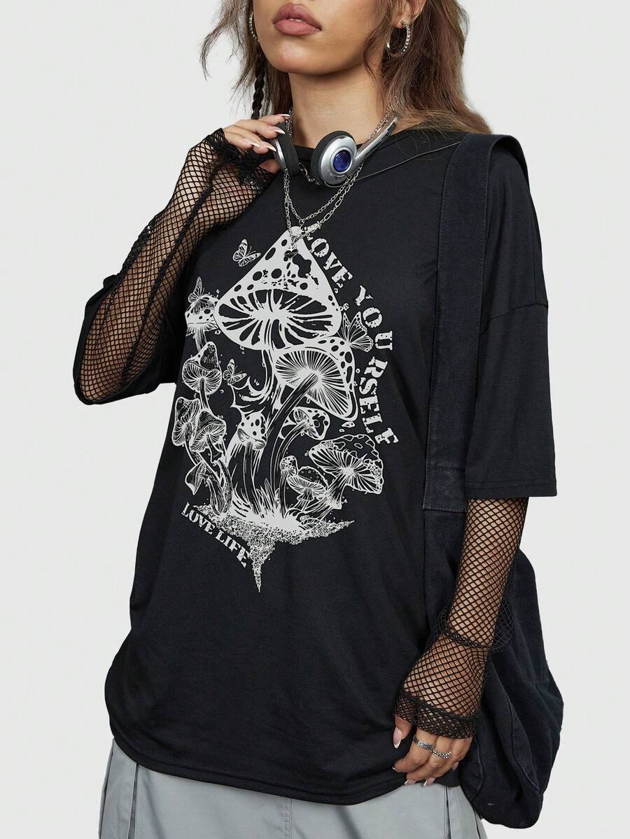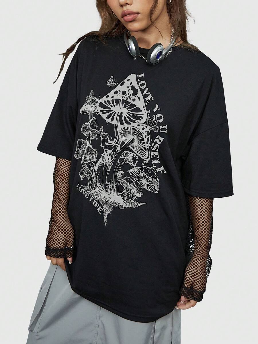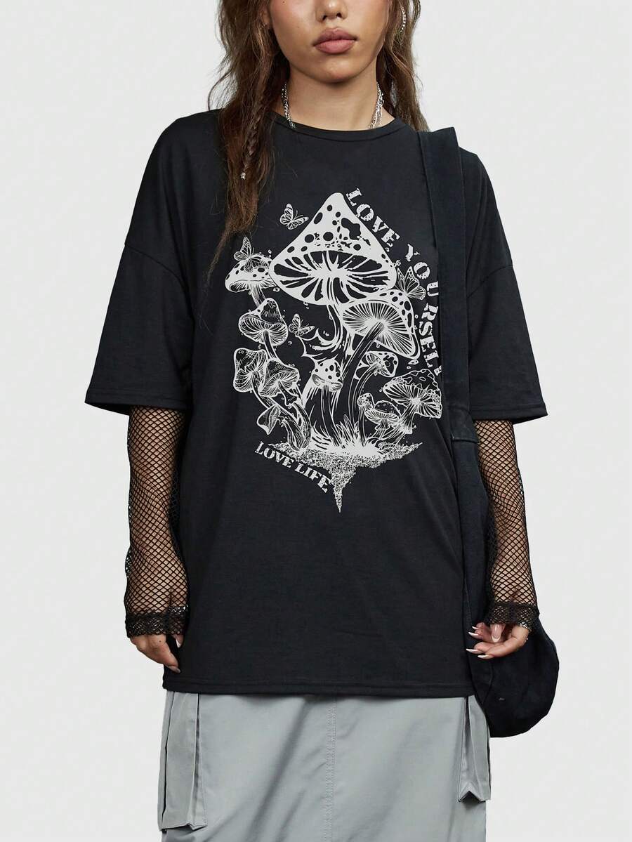 Goth Fun Mushroom And Butterfly Hand-Drawn Solid Color Printed Casual Loose Fit Short Sleeve T-Shirt