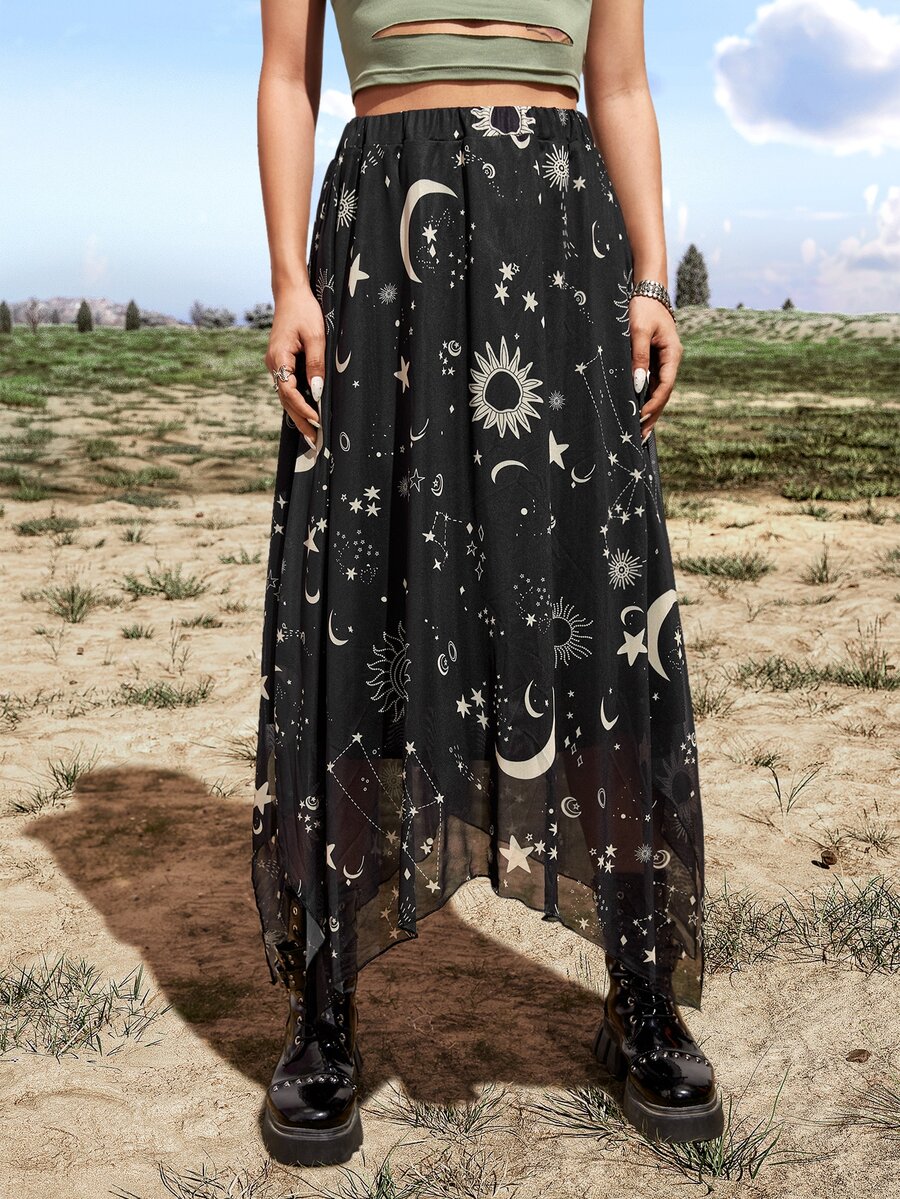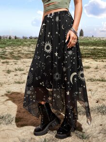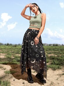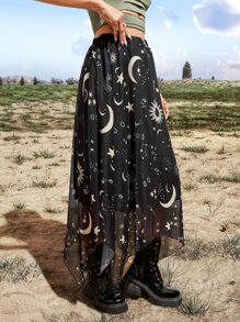Goth Galaxy Print Asymmetric Skirt