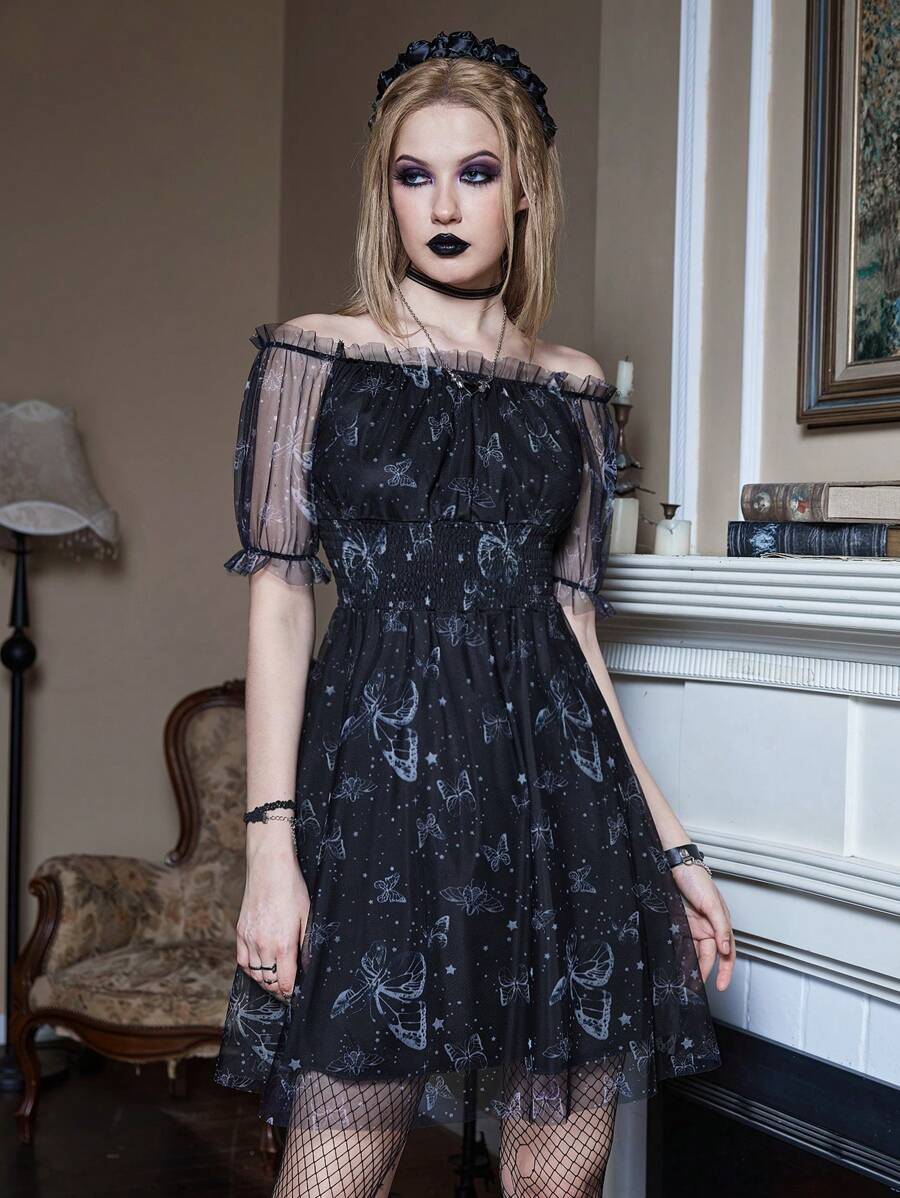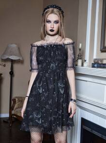Goth Galaxy Print Off Shoulder Mesh Overlay Dress