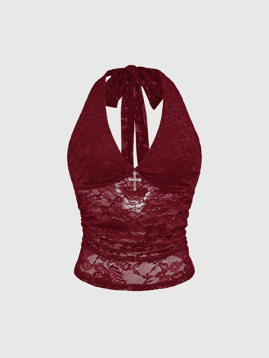 Goth Gothic Cross Decor Lace Halter Neck Bodysuit For Women