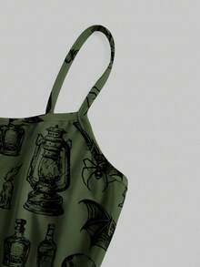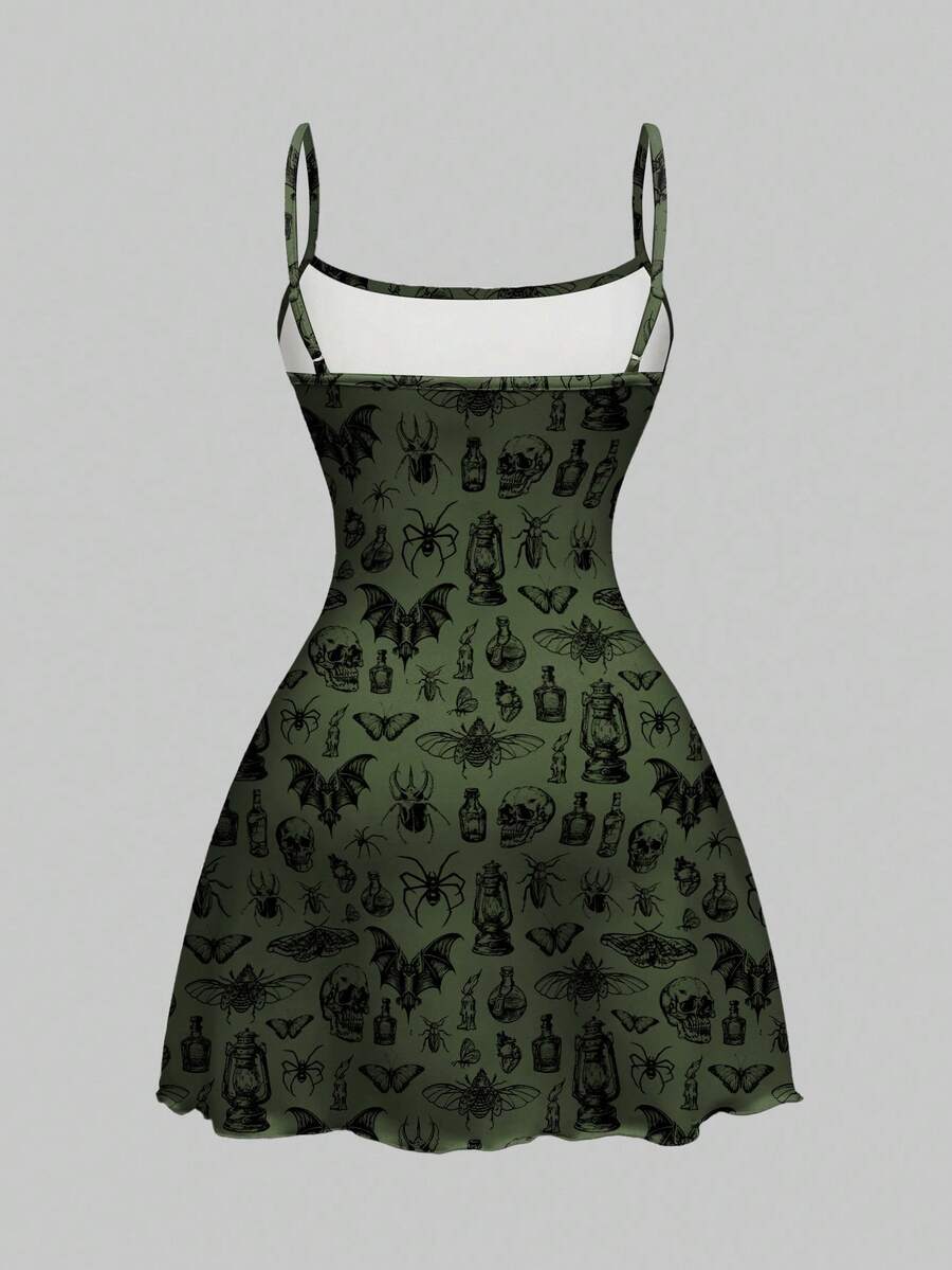 Gothic Dark Mysterious Sexy Skeleton Halloween Green Black Moth Butterfly Cross All-Over Print Mini Dress For Women