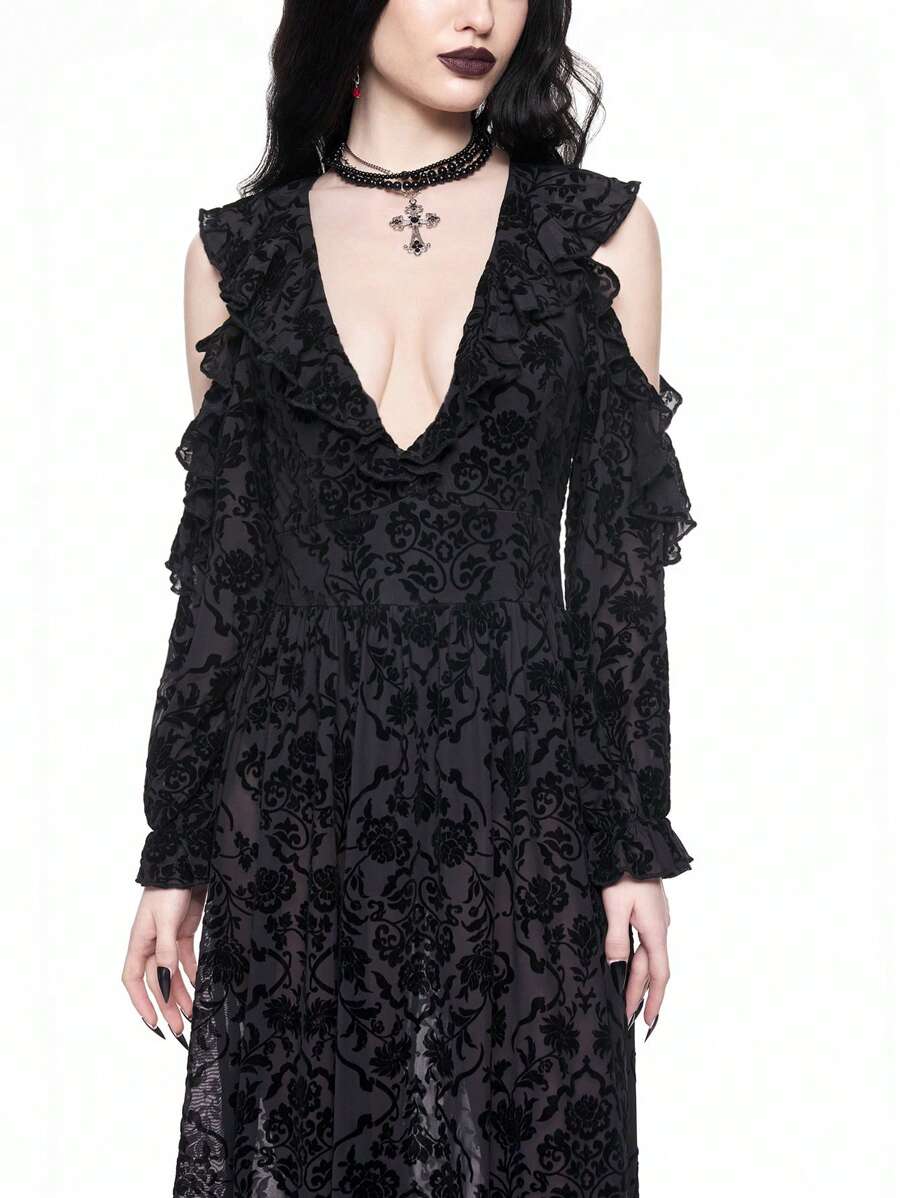 Gothic Palace Black Mesh & Lace Deep V-Neck Vacation Midi Dress For Women