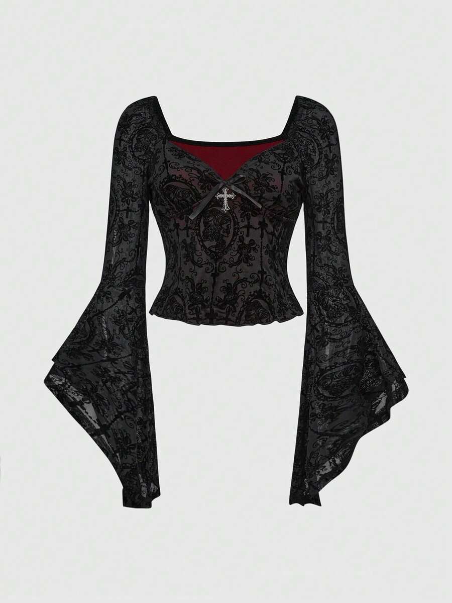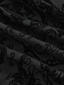 Goth Gothic Retro Skull Cross Flocked Fabric Women Tight Fitting Top, Halloween