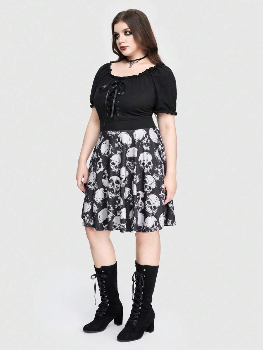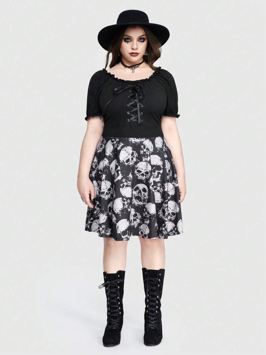 Gothic Skull Print Patchwork Puff Sleeve Plus Size Dress With Round Neckline And Lace-Up