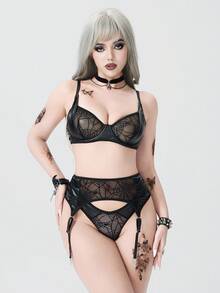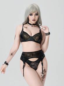 Gothic Spider Web & Pentagram Underwire Bra & Thong Lingerie Set