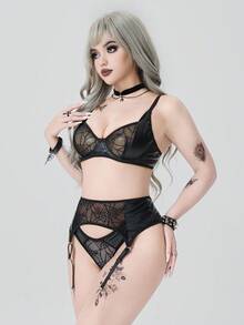Goth Gothic Spider Web & Pentagram Underwire Bra & Thong Lingerie Set