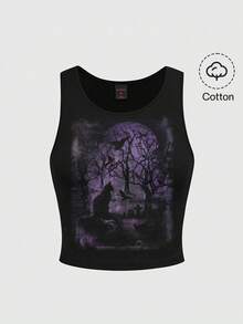 Goth Gothic Style Dark Halloween Grave Cat Black Forest Crow Branch Purple Sleeveless Women Tank Top