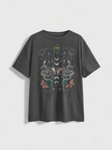 Gothic Style Plant & Snake Eye Print Black Long T-Shirt For Plus Size Women