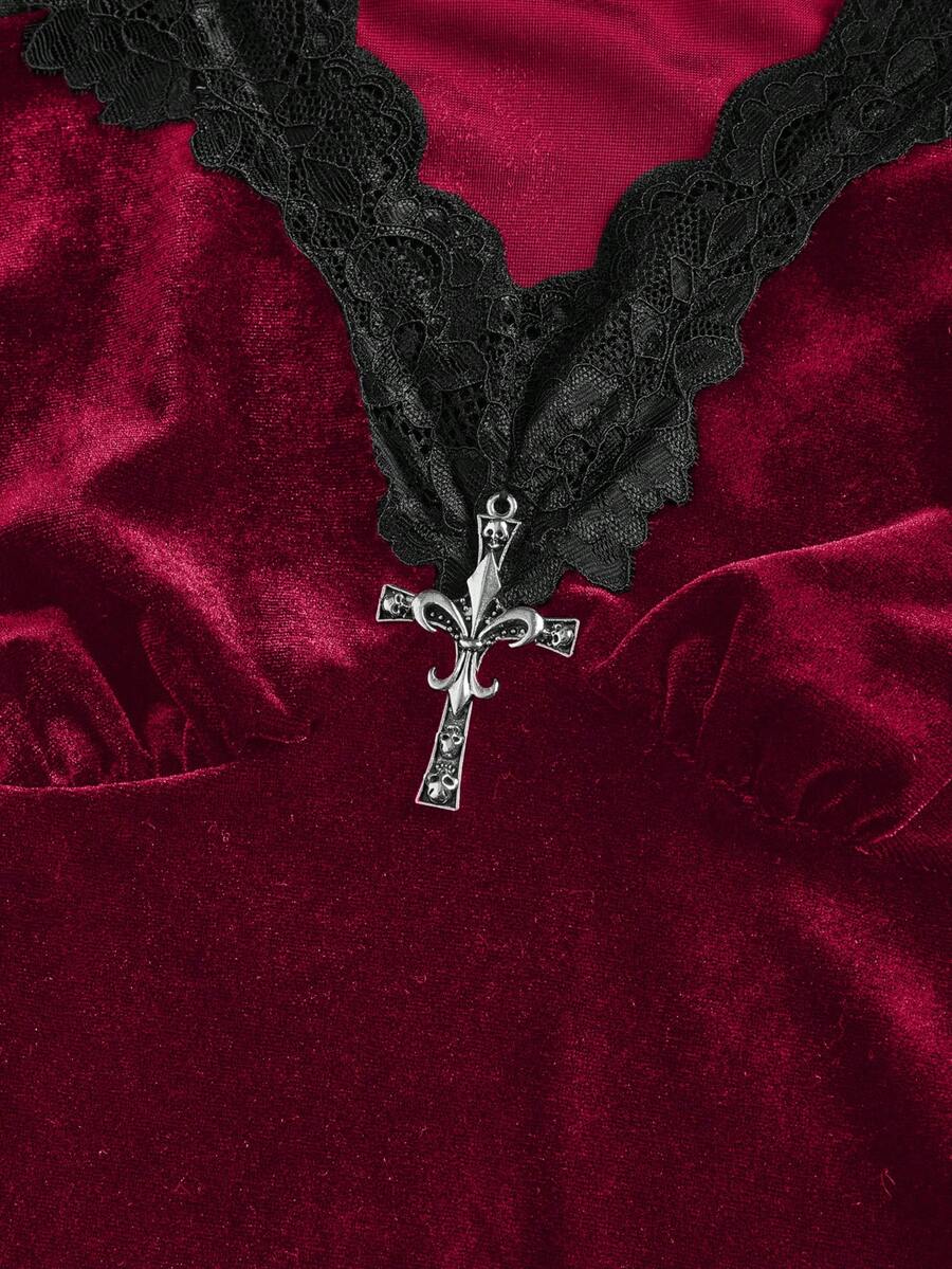 Gothic Velvet & Lace Panel Sexy Romantic V Neck Cross Metal Pendant Flare Sleeve Women Top