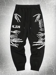 Goth Guys Skeleton Hand & Letter Graphic Drawstring Waist Sweatpants