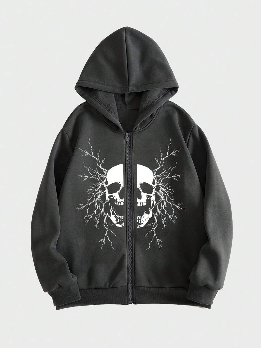 Goth Guys Skull Print Zip Up Thermal Lined Hoodie