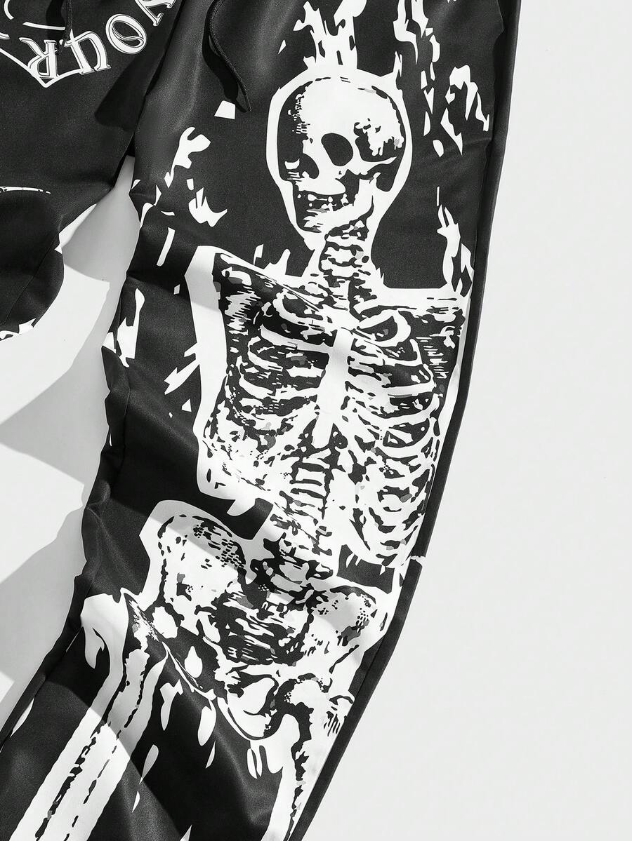 Goth Guys Slogan & Skeleton Print Drawstring Waist Pants