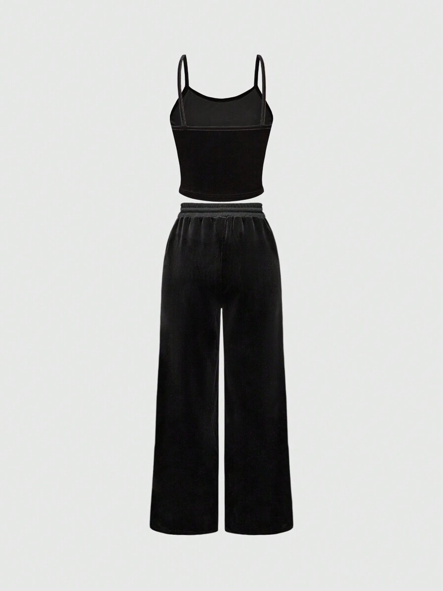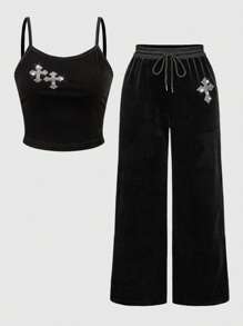 Gyaru Summer Beach, West Concert, Festival Streetwear Outfit For Women - 2pcs Black Gothic Velvet Cross Rhinestone Camisole And Elastic Plus Size Pants Set