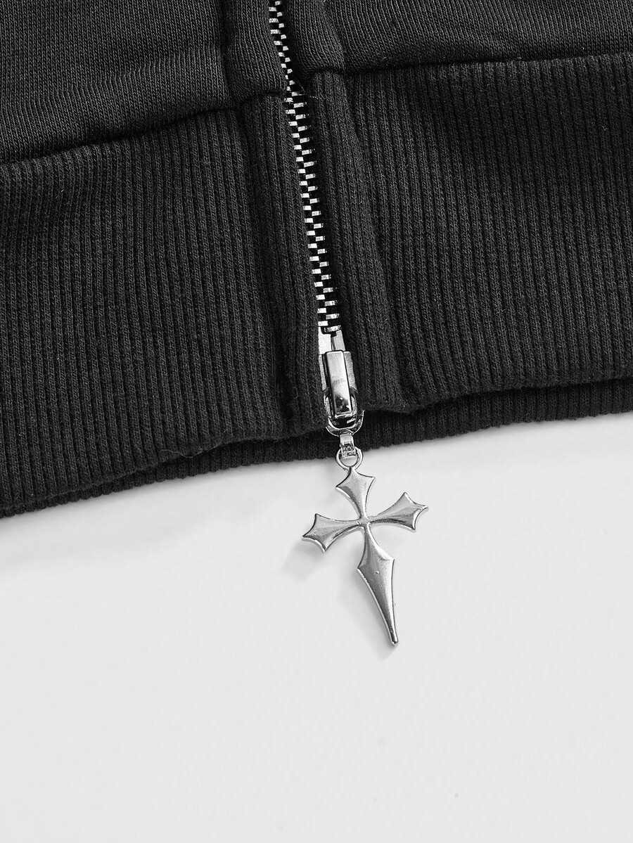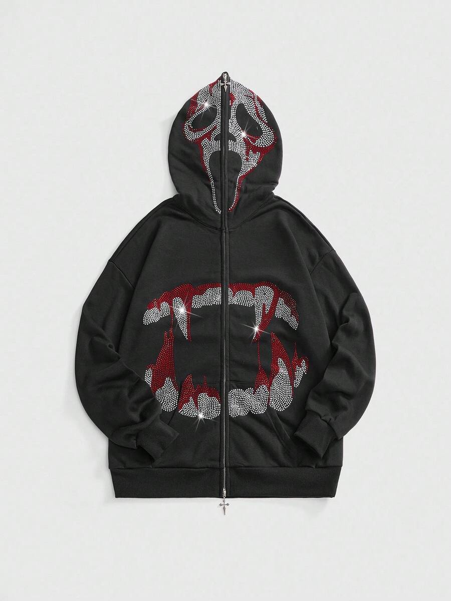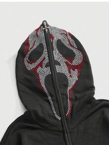 Goth Halloween Casual Skull Rhinestone Decor Hooded Open Front Fuzzy Collar Loose Fit Women Sweatshirt