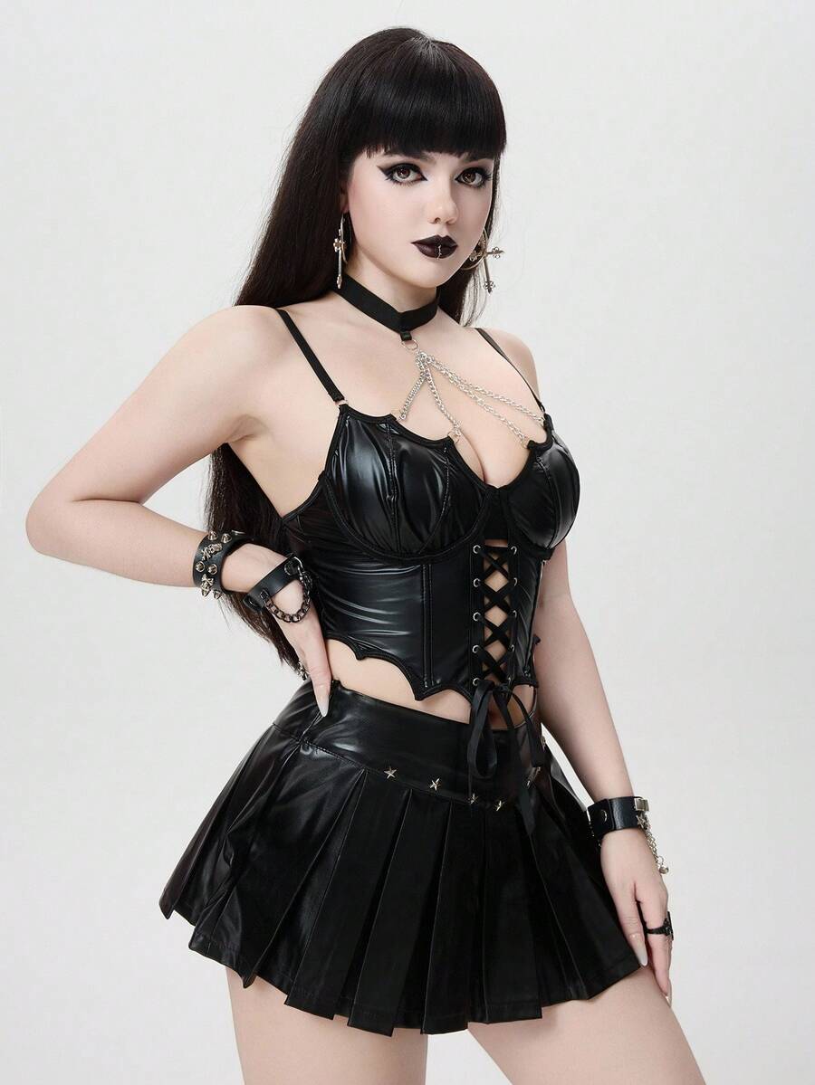 Halloween Gothic Bat Collar Metal Chain Decor Tie-Up Design PU Fabric Women Top