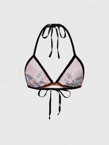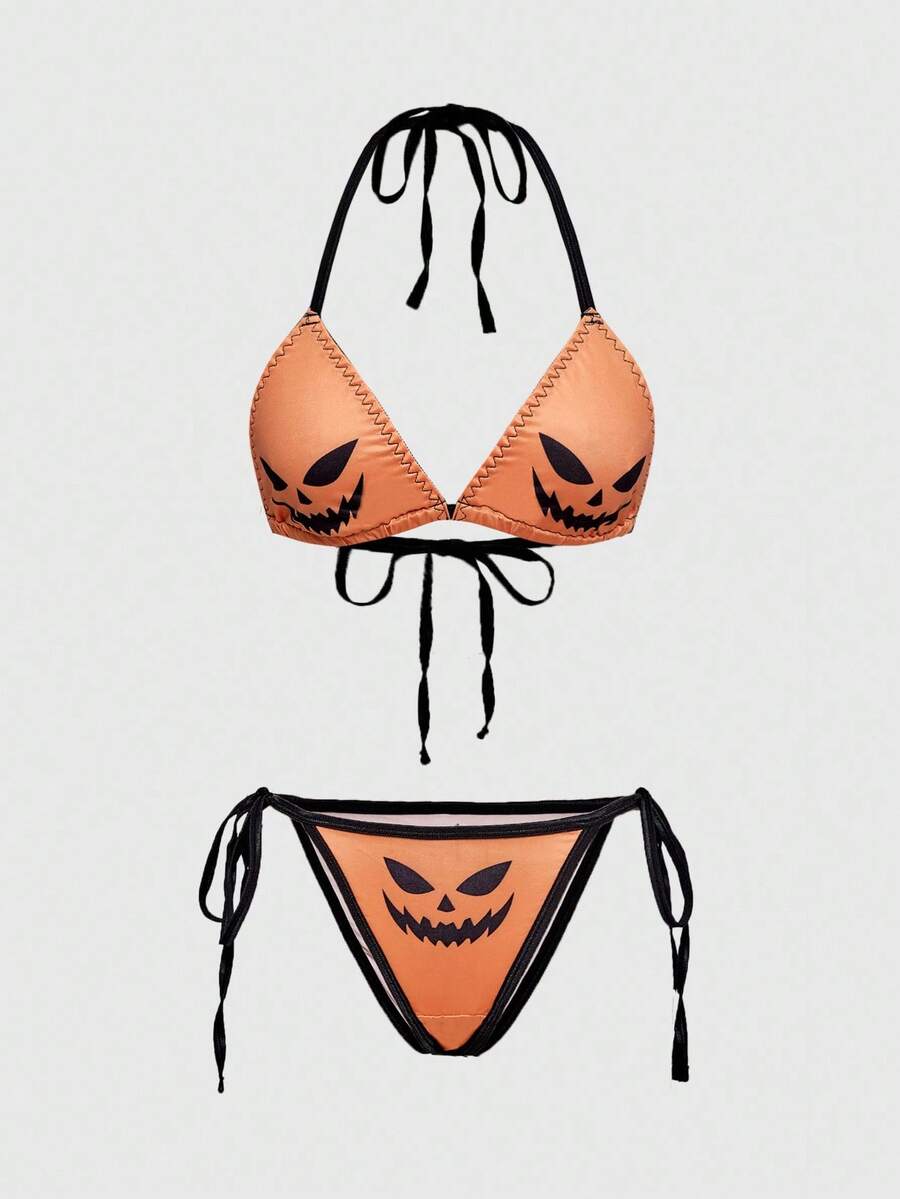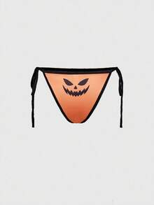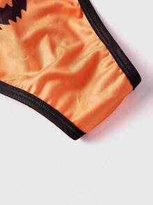 Goth Halloween Pumpkin Smiling Face Embroidered Drawstring Halter Flannel Bralette & Thong Lingerie Set