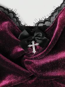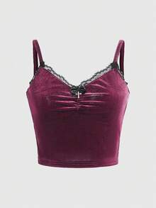 Goth Lace Patchwork Crushed Velvet Cami Top With Pleats On The Front