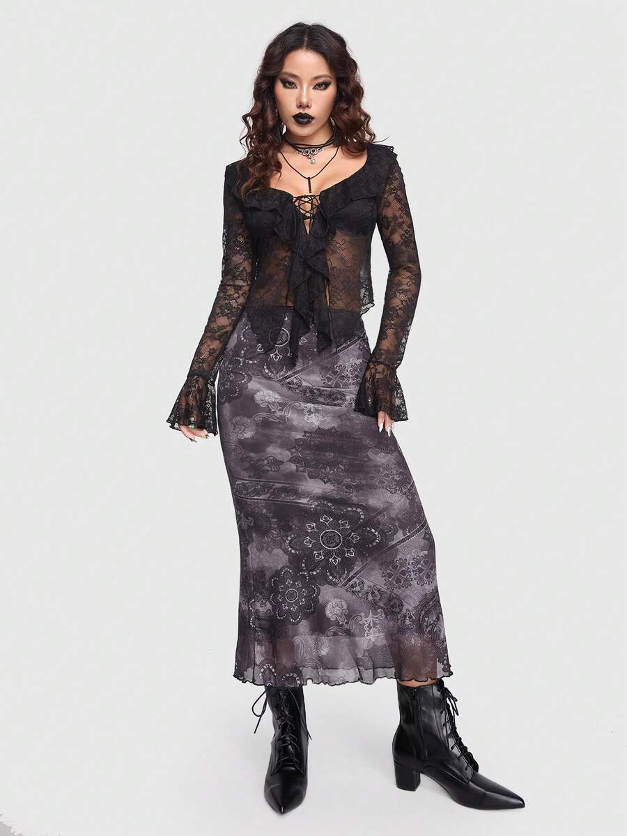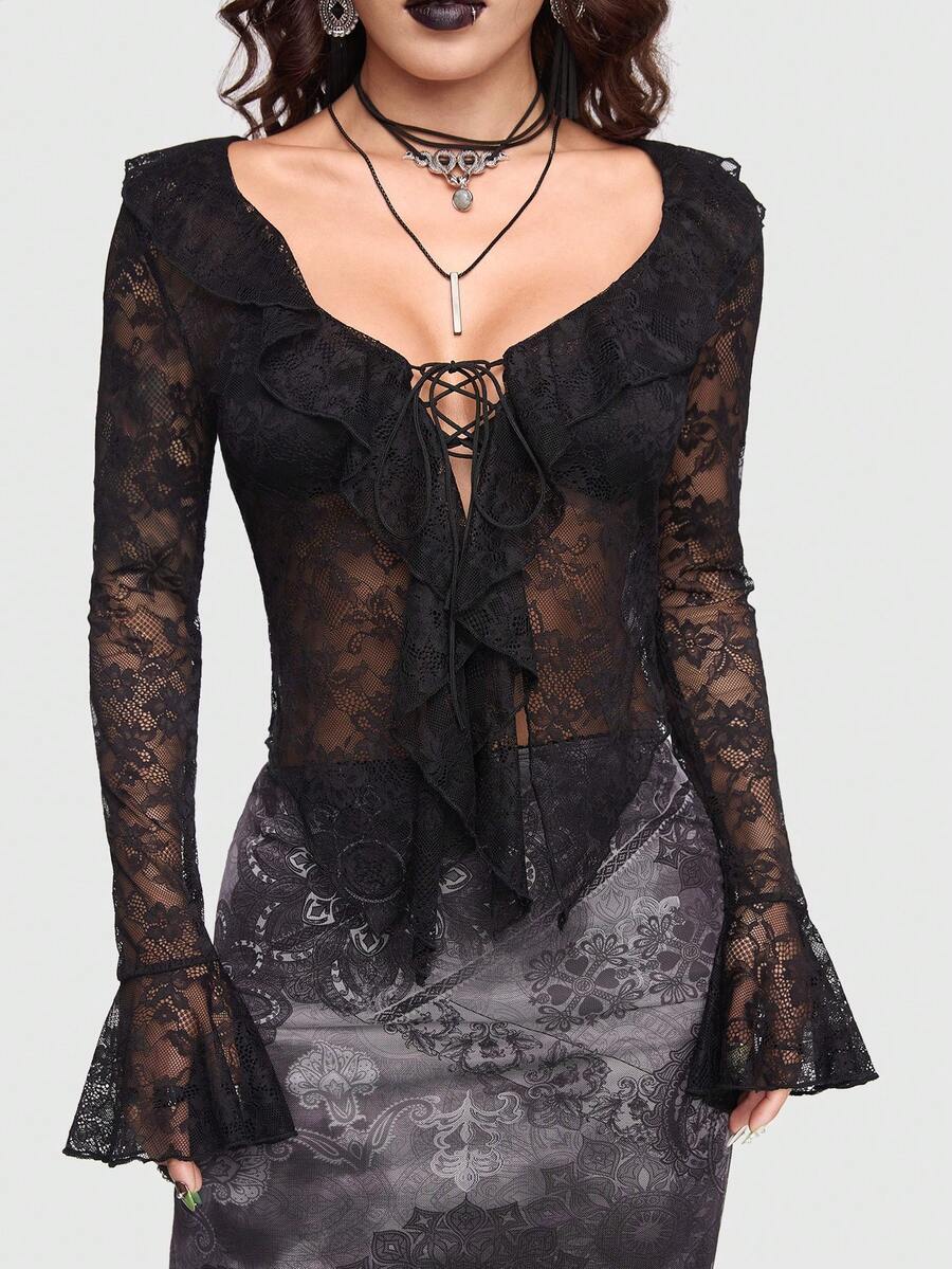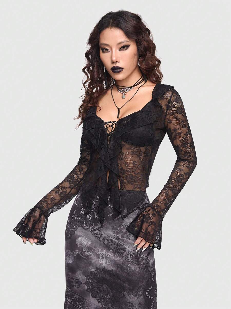 Goth Lace-Up Front And Tight-Fitting Flare Sleeve Blouse