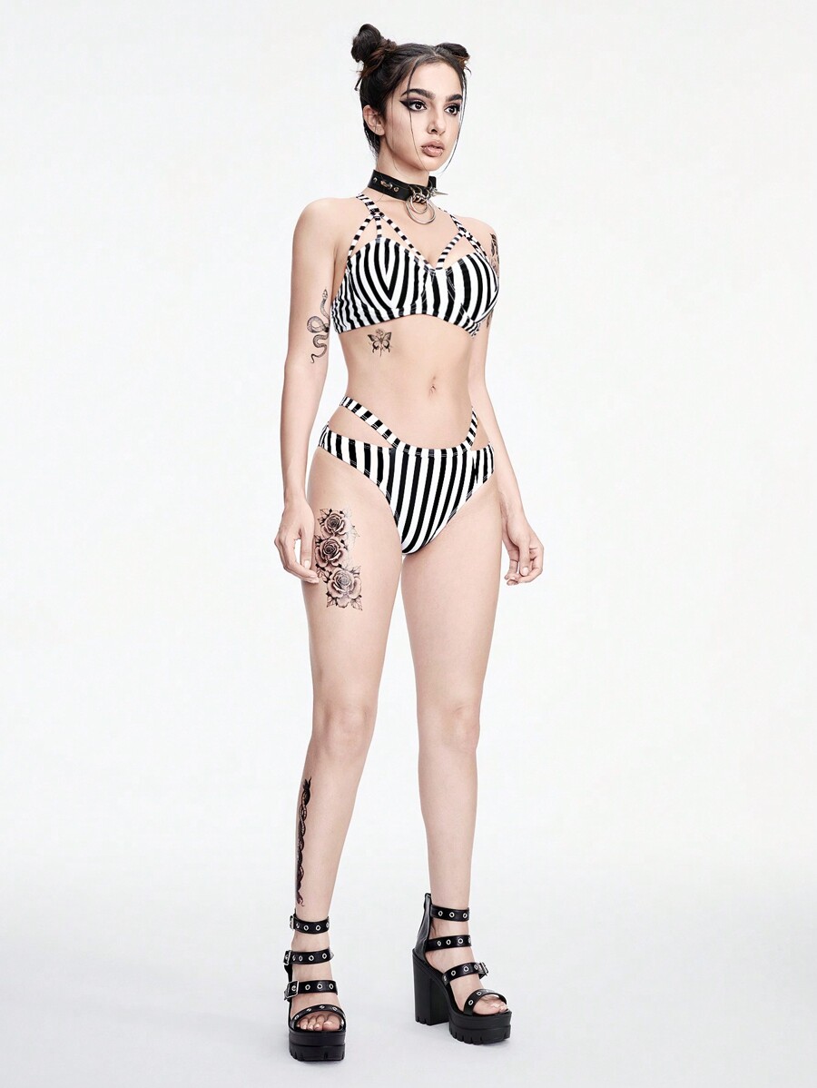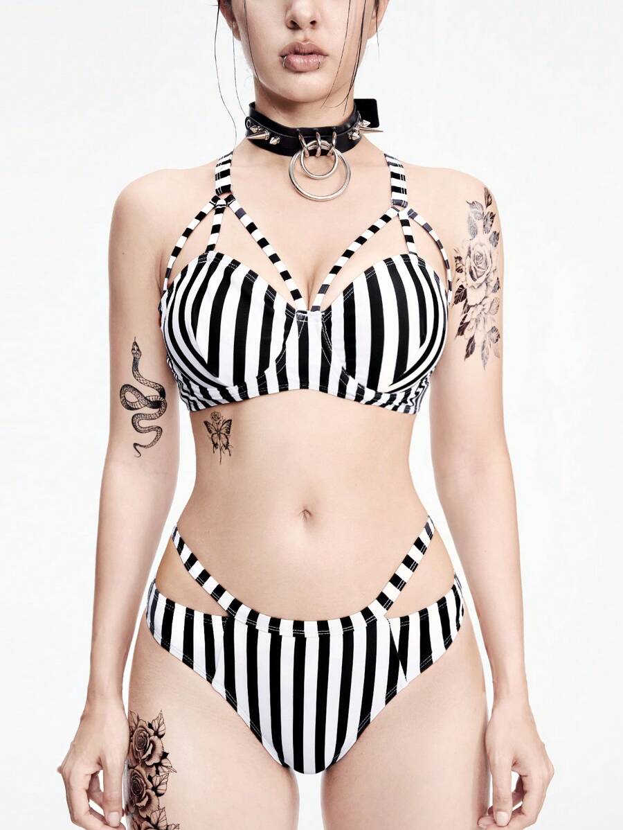 Goth Ladies' Striped Print Hollow Out Sexy Bikini Set, Split Swimwear,Summer Beach