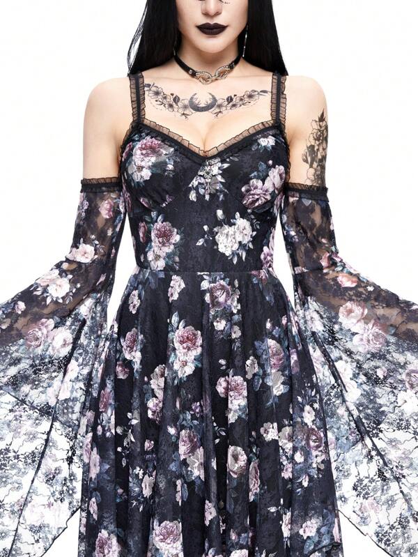 Women's Halloween Lavish Palace Rose Lace Allover Print Spaghetti Strap Goth Dress With Flared Sleeves And Asymmetrical Hem