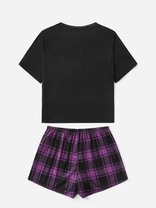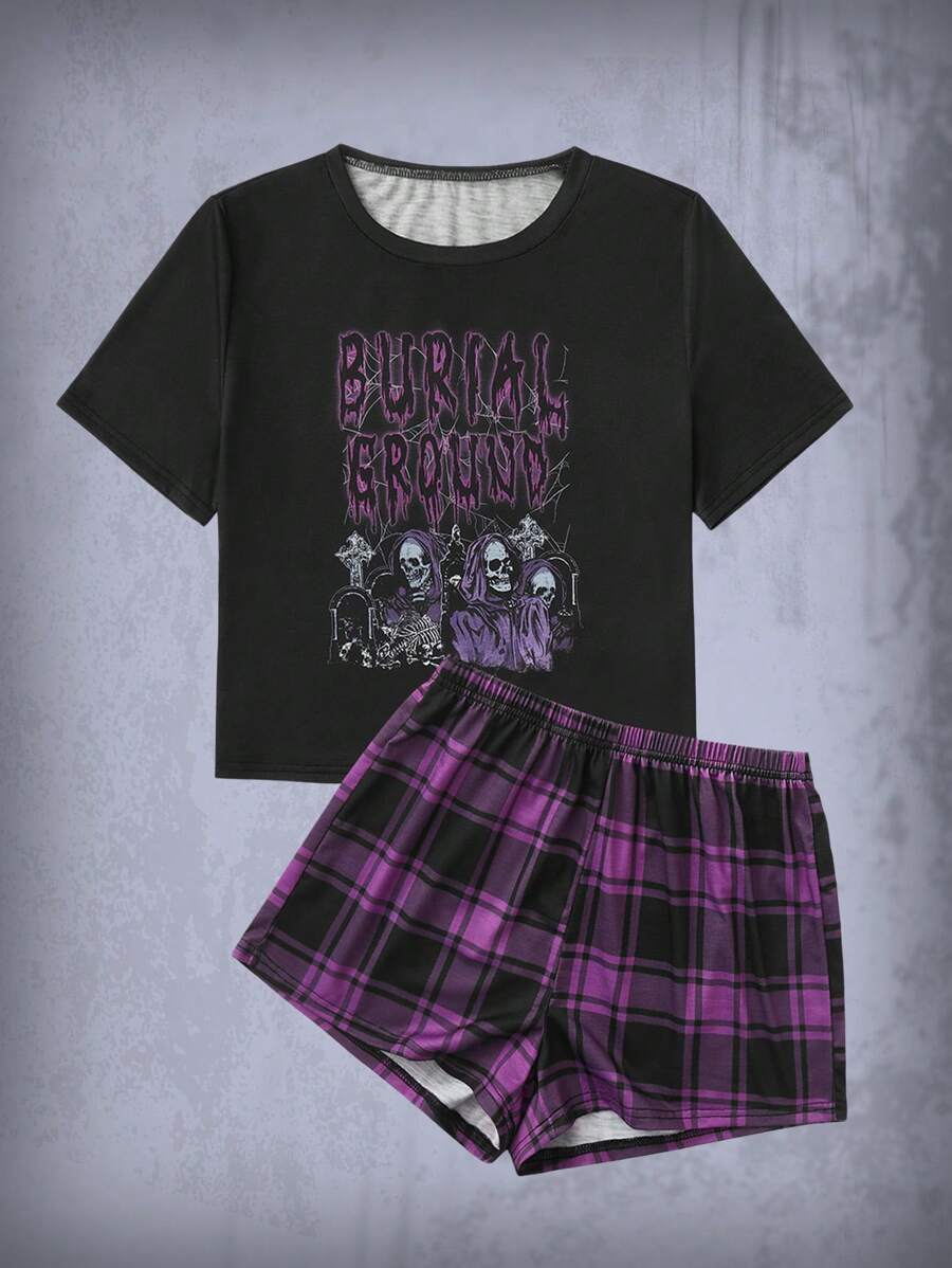 Goth Letter Skeleton Graphic Plaid Pajama Set