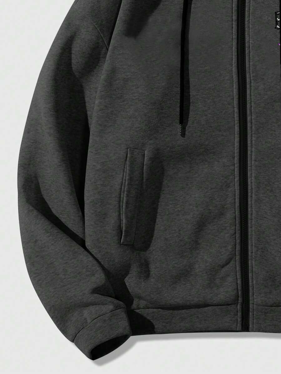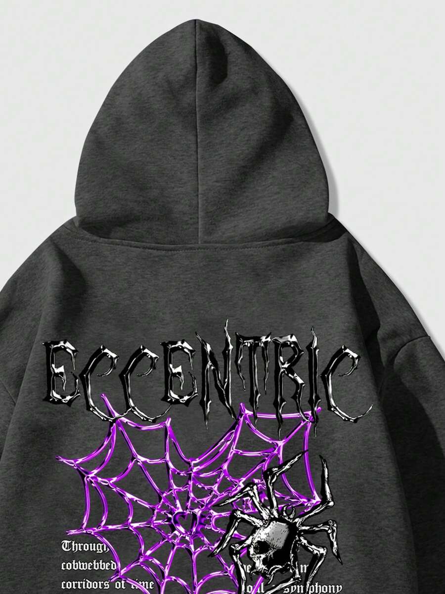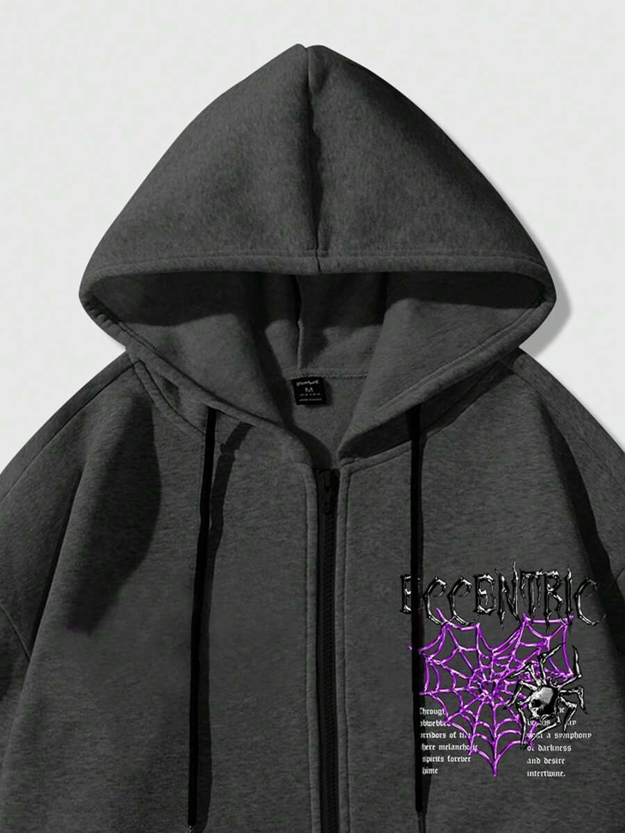 Goth Men Slogan & Spider Web Print Kangaroo Pocket Drawstring Thermal Hoodie