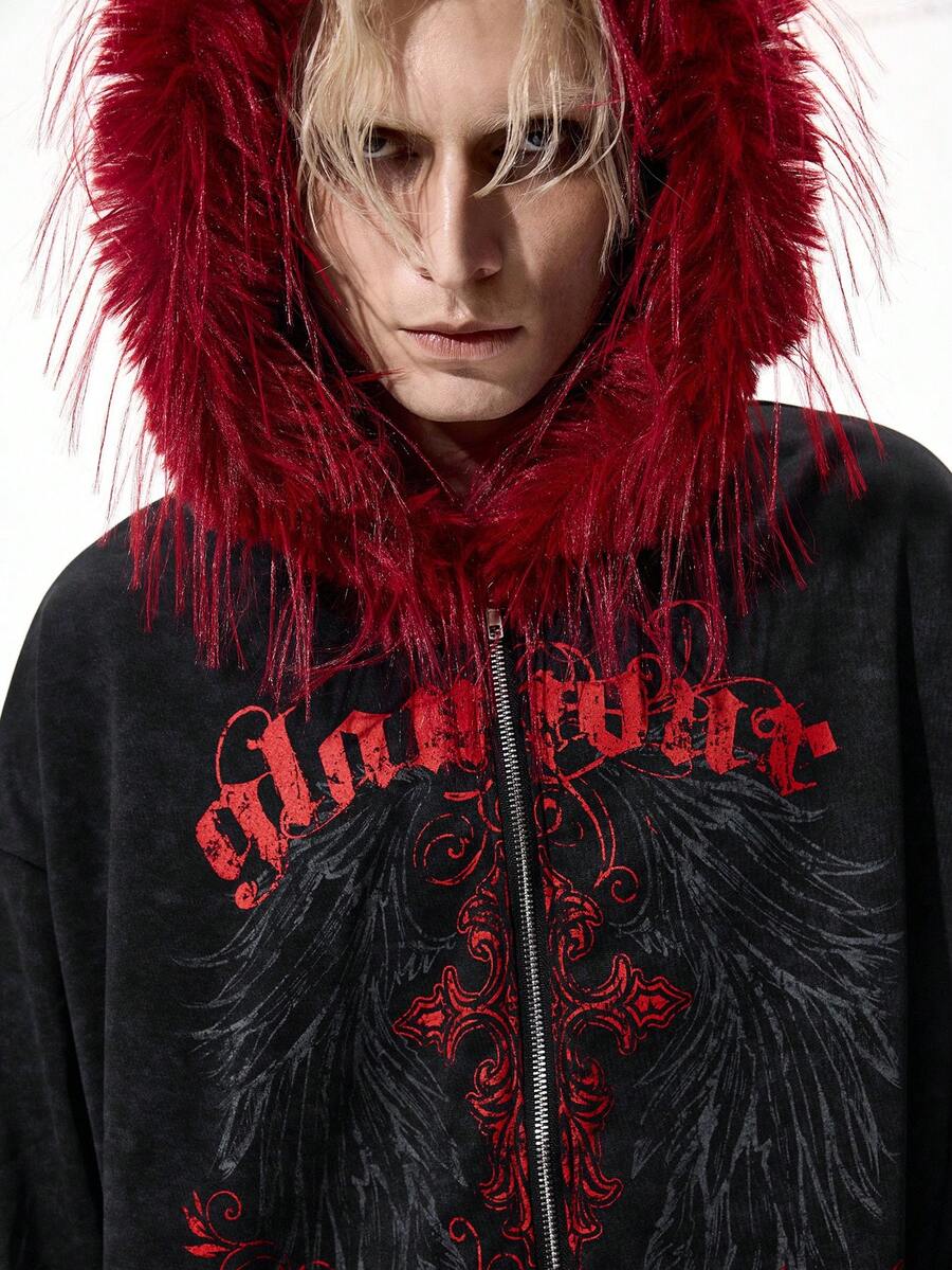 Goth Men's Casual Dark-Colored Fuzzy Trim Zip-Up Hoodie Sweatshirt, Autumn