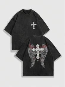Goth Men's Cross And Wing Print Round Neck Short Sleeve Casual T-Shirt