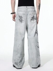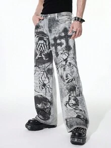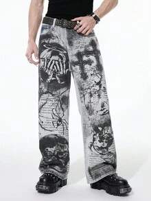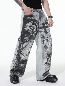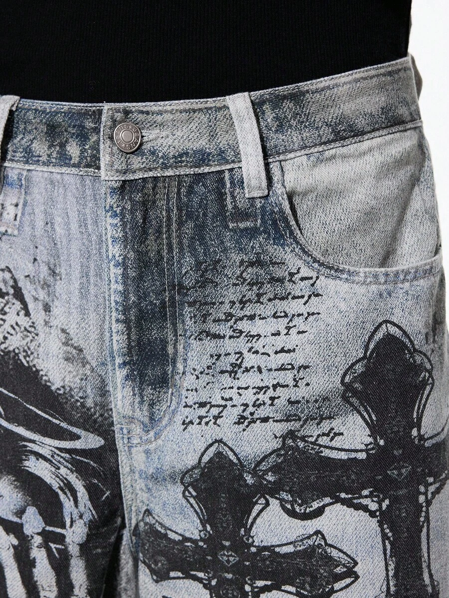 Men's Dark Gothic Cross Casual Wide Leg Button Pocket Jeans Halloween