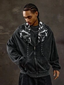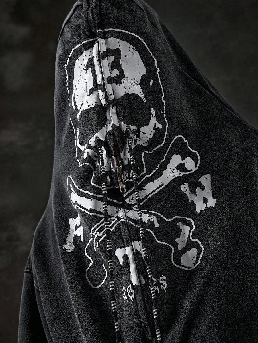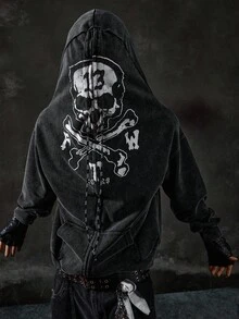 Goth Men's Dark Style Skull Print Zip-Up Hoodie Jacket, Fall