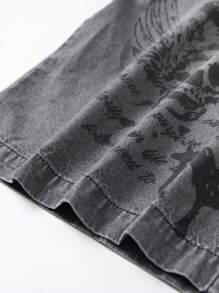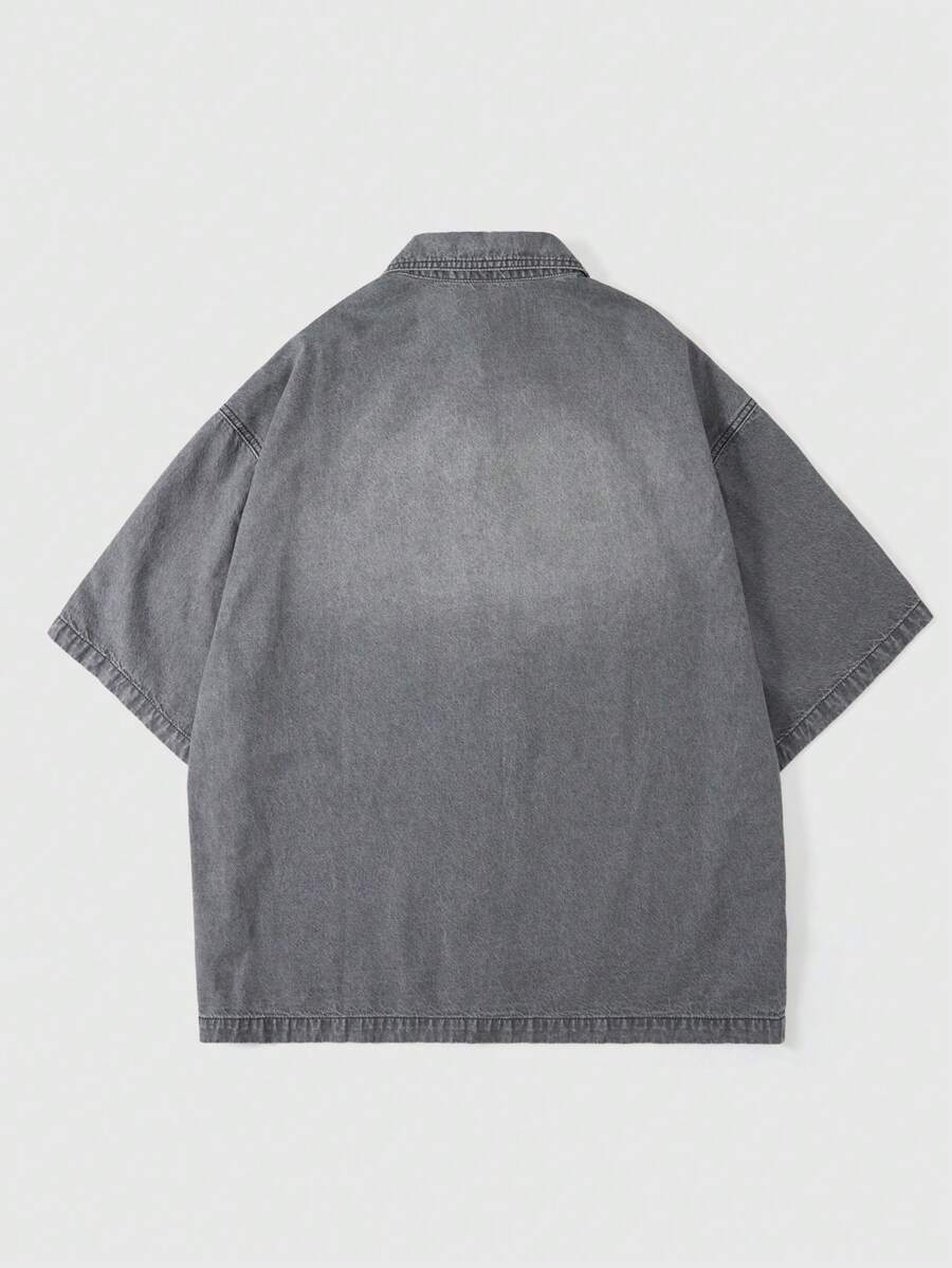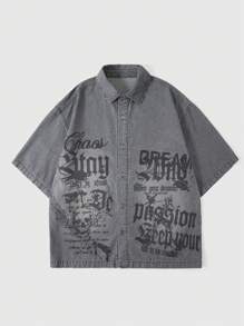 Goth Men's Drop Shoulder Short Sleeve Single-Breasted Casual Denim Shirt With Letter Skull Print