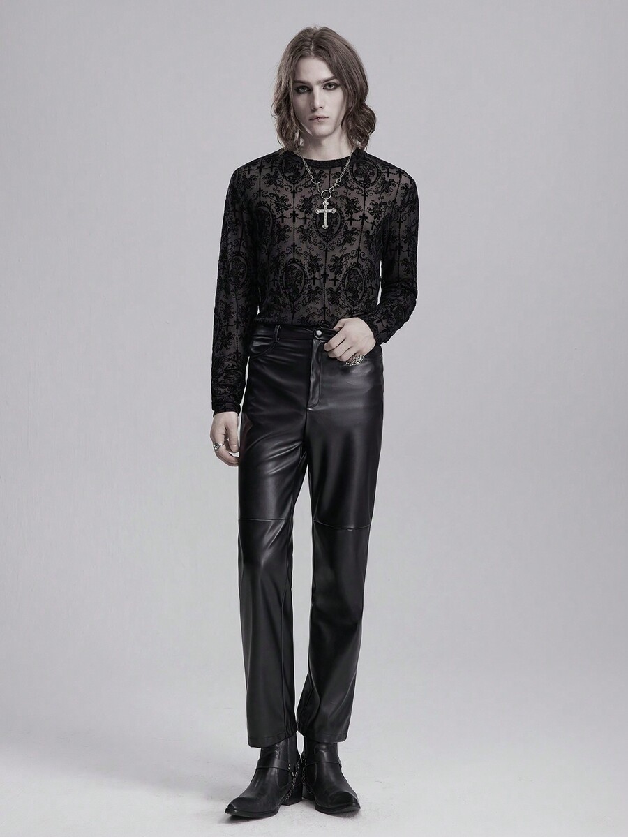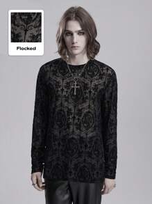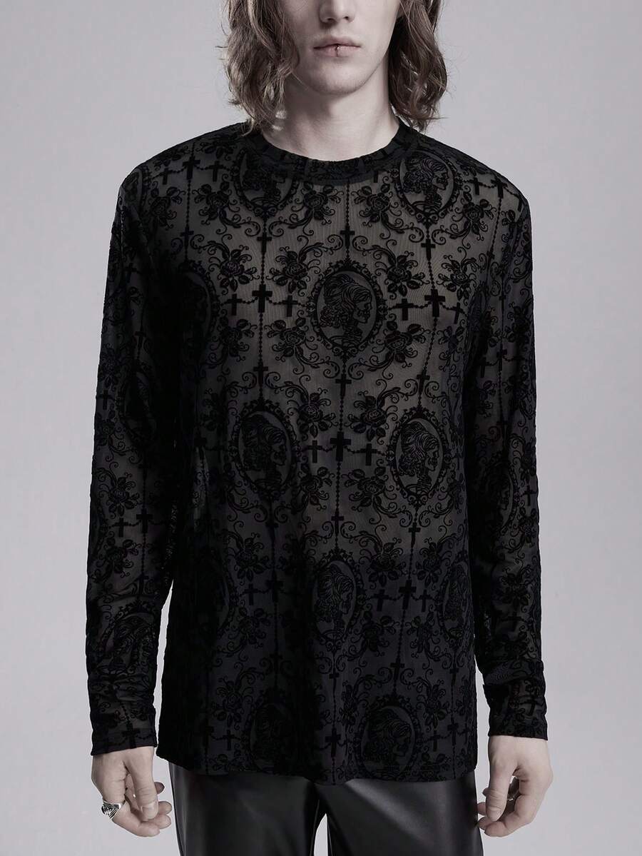 Goth Men's Floral & Cross Print Mesh Crew Neck Long Sleeve Fashion T-Shirt, Spring/Summer